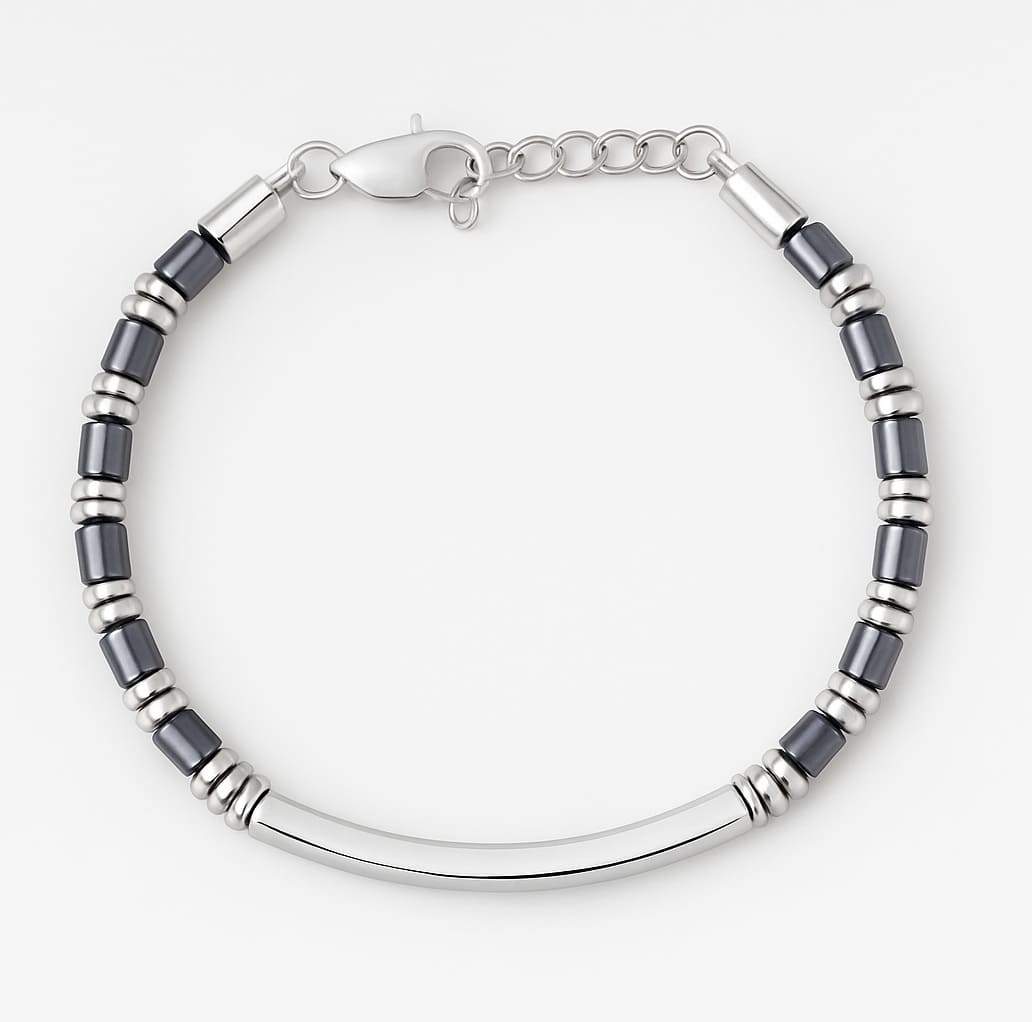 Bracelet homme hématite noire et acier argenté – Bijou artisanal élégant et équilibrant
