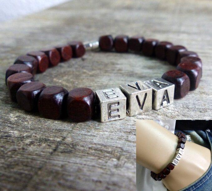 Habillez votre poignet avec les initiales de vos enfants ou faites en cadeau emprunt d’émotion avec ce Bracelet bois personnalisé perles carrées homme composé de perles carrées en bois marron chocolat et lettres en résine synthétique argentée montées sur un cordon de cuir marron. Personnalisable, ce joli Bracelet en perles de bois carrées de 8mm avec ces perles lettres gravées en métal argenté fera un cadeau parfait pour la fête des pères par exemple ou les Noces de bois qui célèbrent le 5ème anniversaire de mariage;