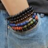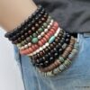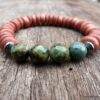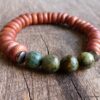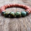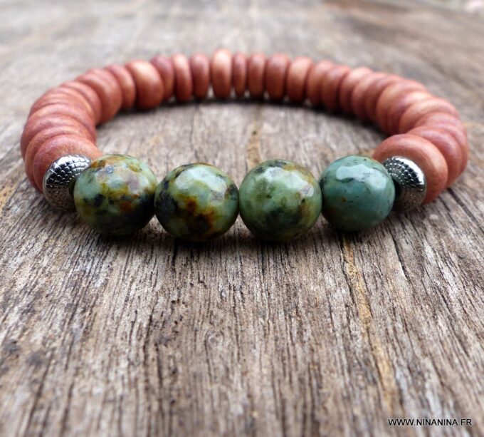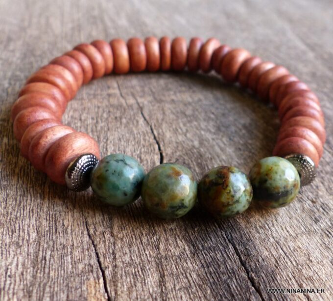Bracelet turquoise africaine et perle bois sur fil elastique composé de turquoises africaines rondes facettées , de rondelles de bois marron clair et de rondelles en métal noir montées sur un lien elastique.
