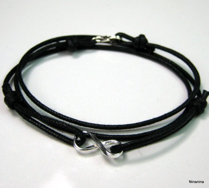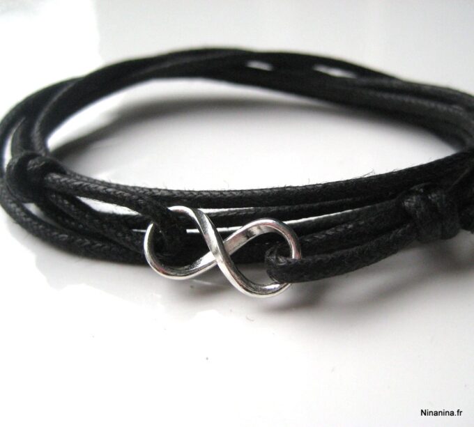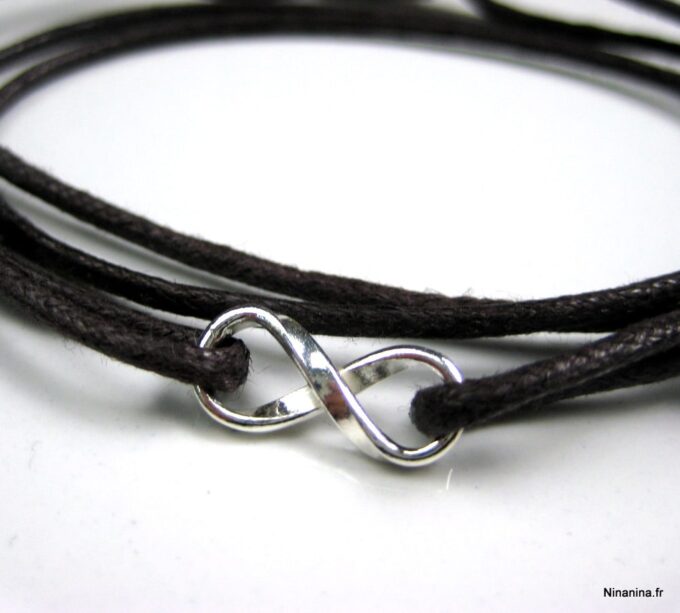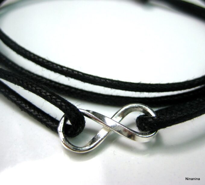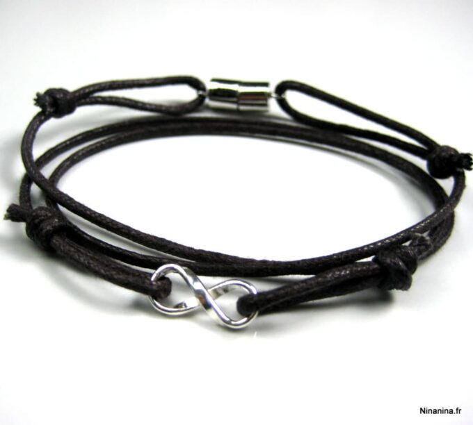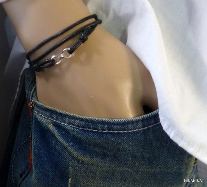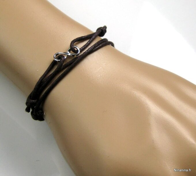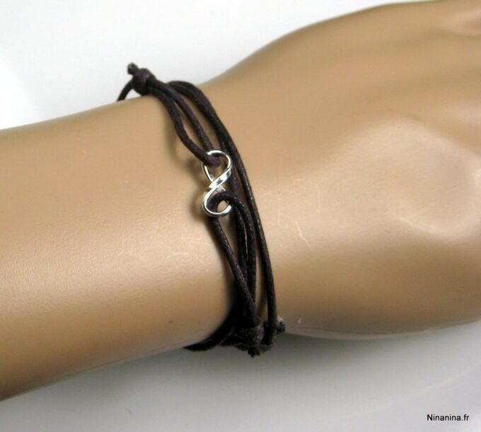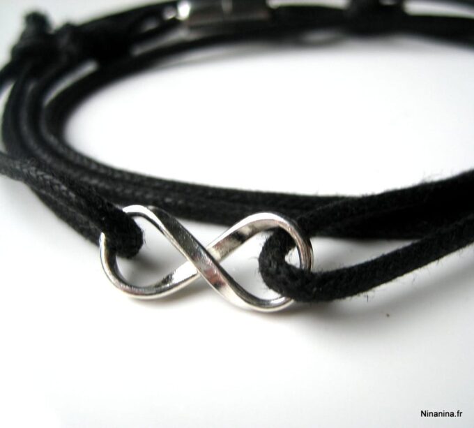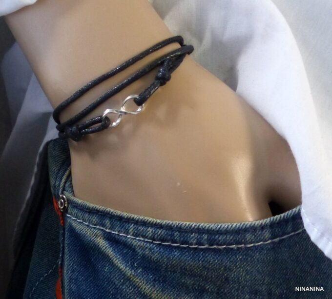 Bracelet homme cordon infini argent massif composé d’une entretoise infini en argent 925 montée sur un cordon de coton ciré (2mm de diamètre).