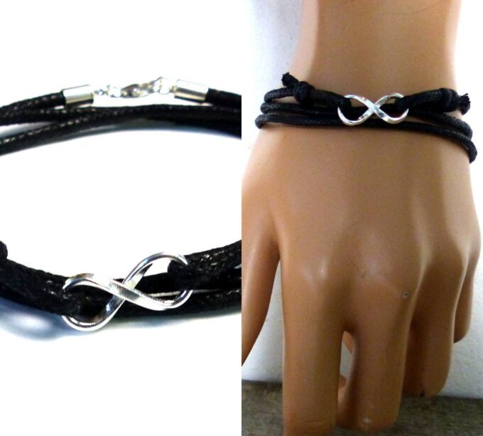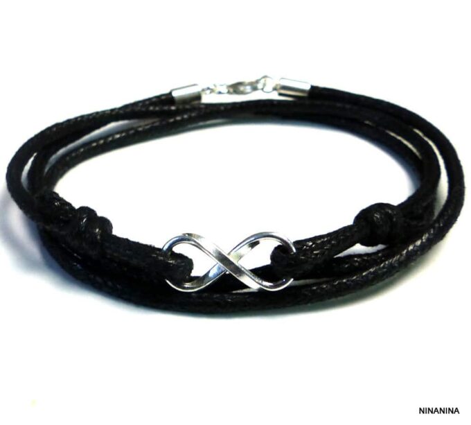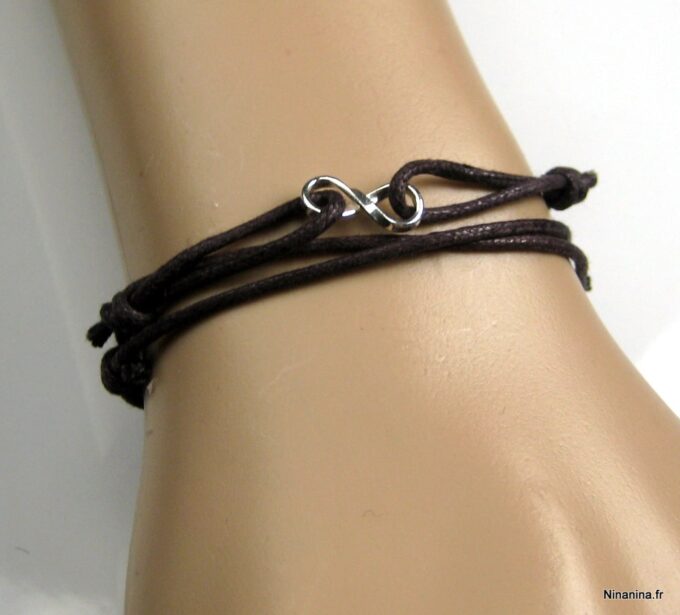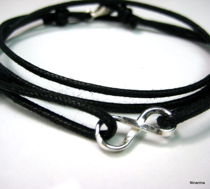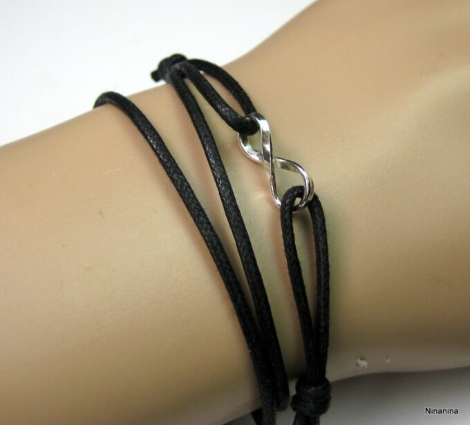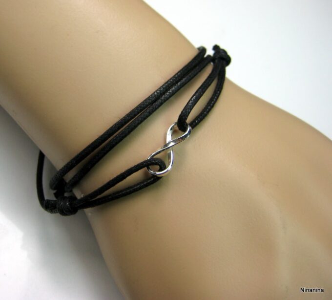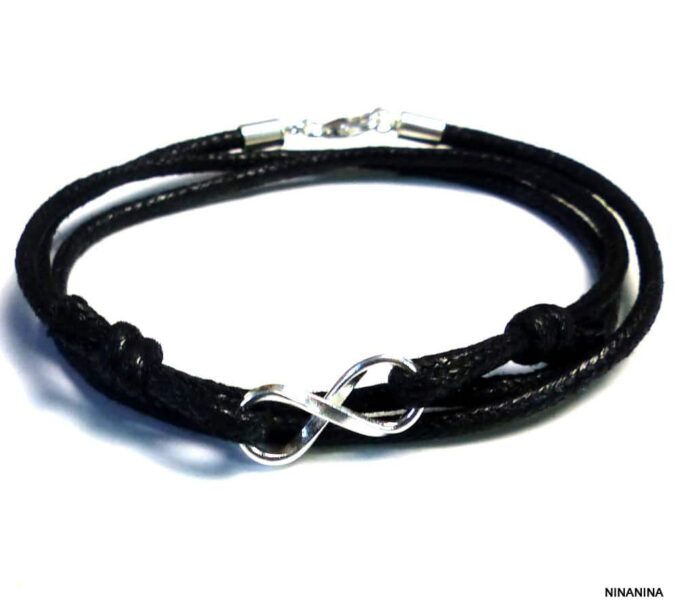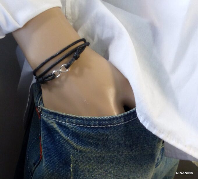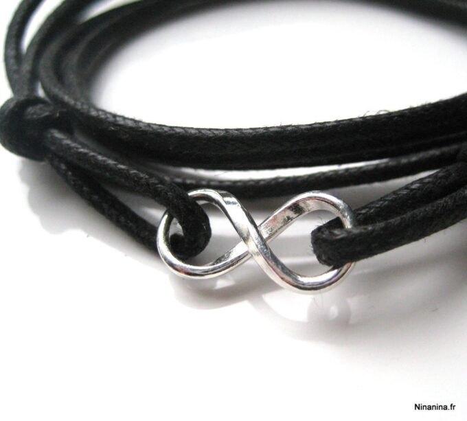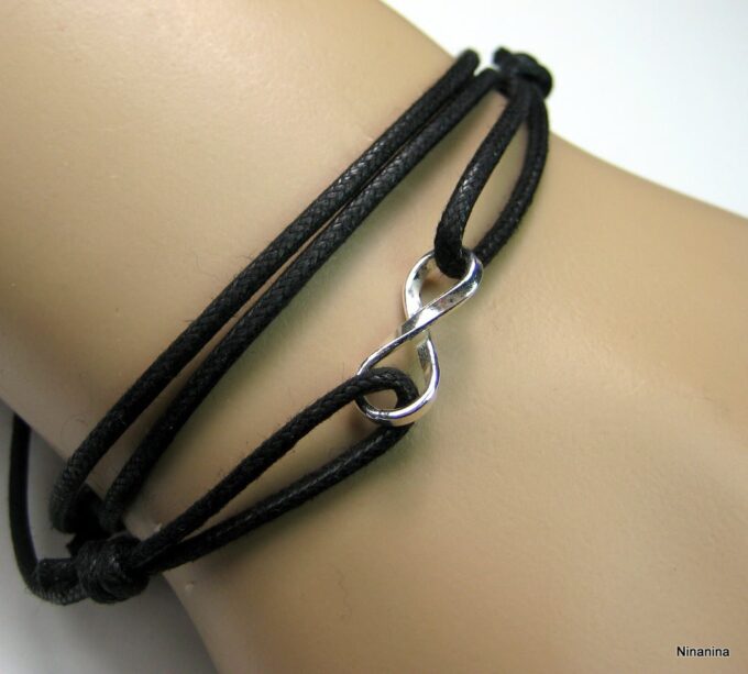 Bracelet homme cordon infini argent massif composé d’une entretoise infini en argent 925 montée sur un cordon de coton ciré (2mm de diamètre).