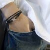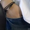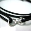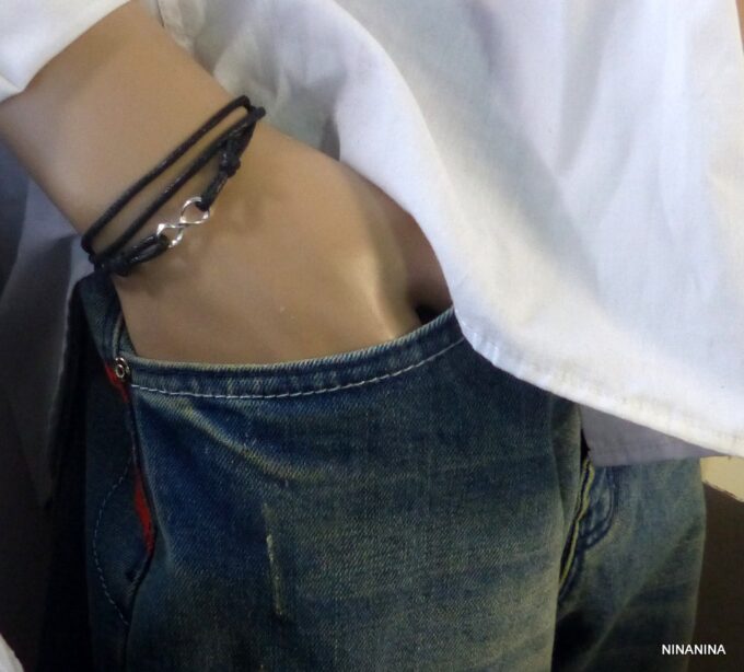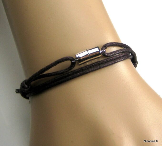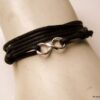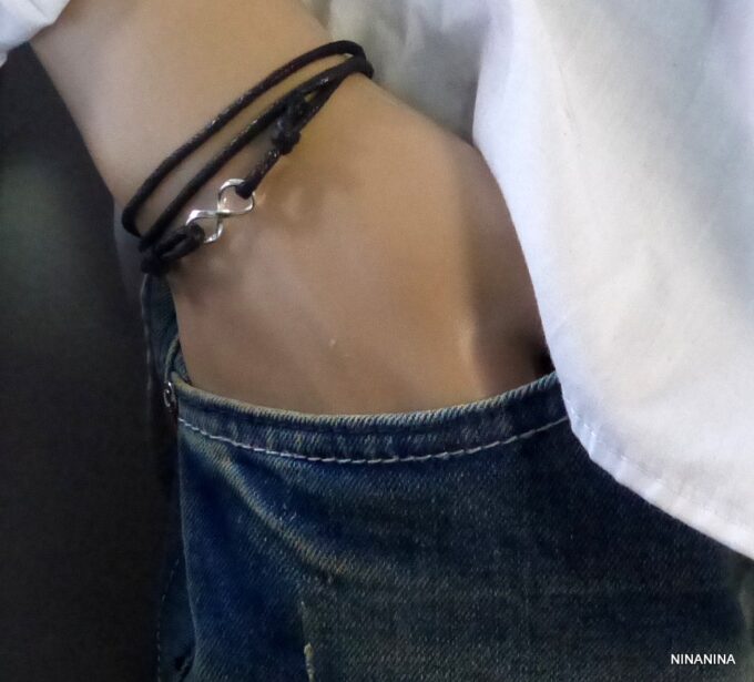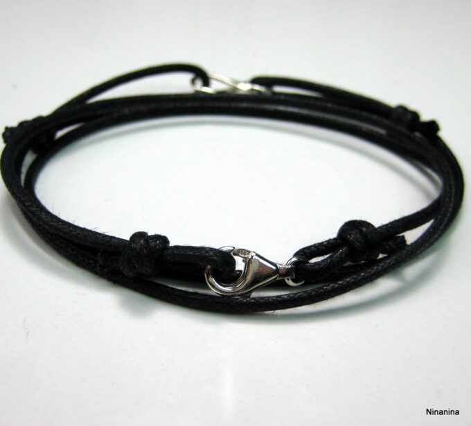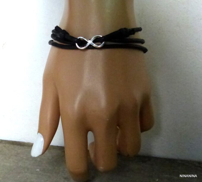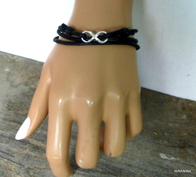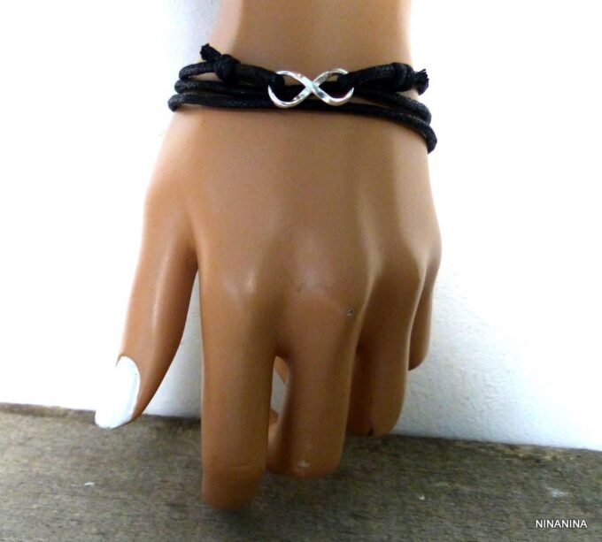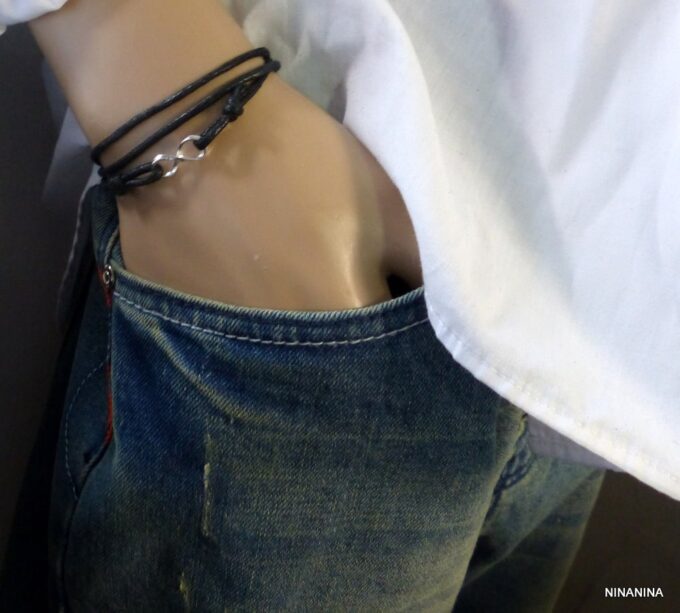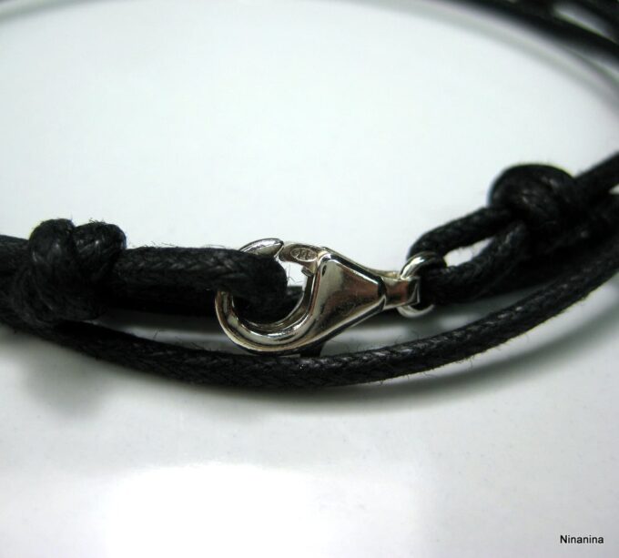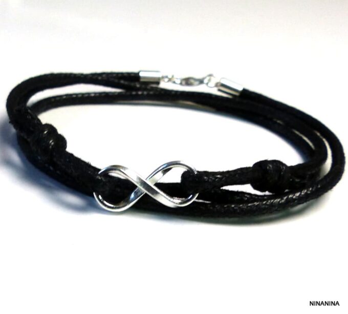 Bracelet homme cordon infini argent massif composé d’une entretoise infini en argent 925 montée sur un cordon de coton ciré (2mm de diamètre).