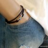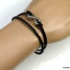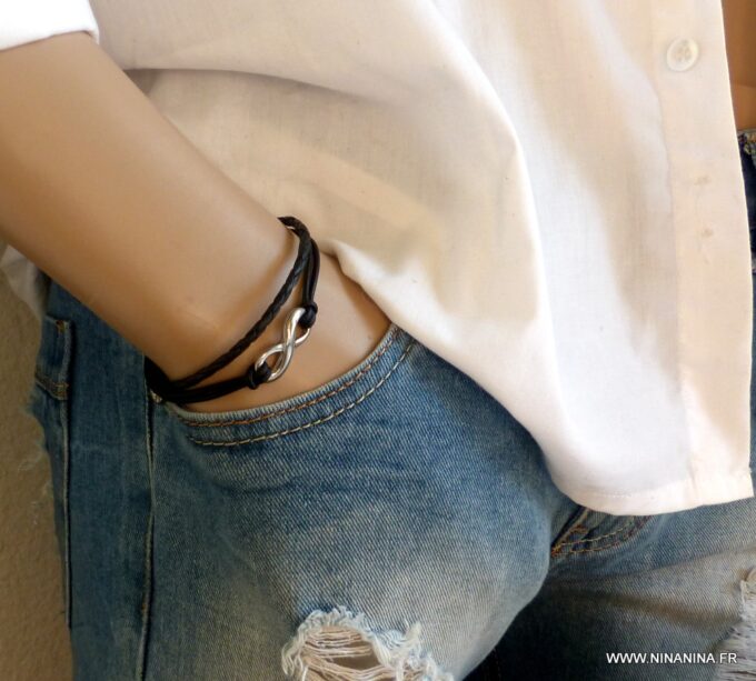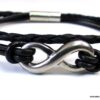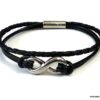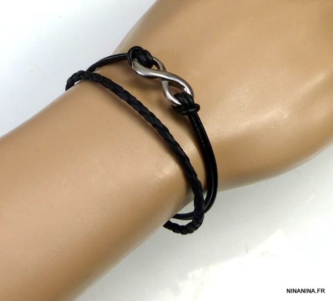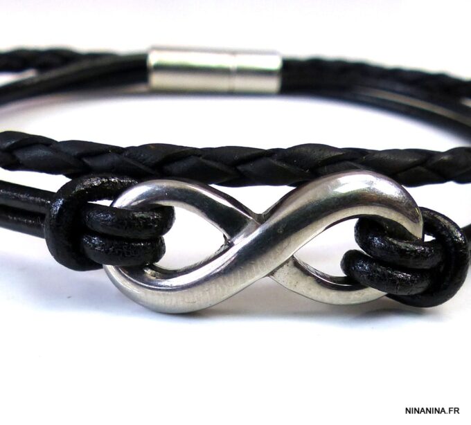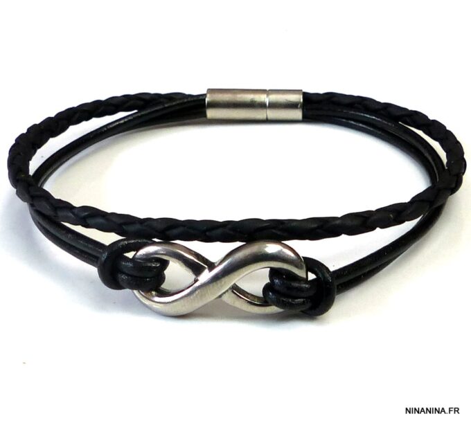 Bracelet infini cuir tressé et Acier inoxydable argenté composé d’un connecteur infini en acier inoxydable montés sur un double cordon de cuir lisse (2 mm de diamètre) et un cordon de cuir tressé (3 mm de diamètre) noir.