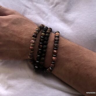 Ce Bracelet homme ultra tendance est fabriqué à la main avec des perles en pierre naturelle de grande qualité, de façon artisanale dans notre atelier en France. Diamètre des perles : 0,8 cm. Cette pièce faite sur mesure convient pour la majorité des poignets d’homme et de femme, la longueur proposée est de 19 cm. Merci toutefois de laisser un commentaire si vous désirez une autre longueur.