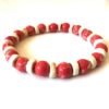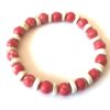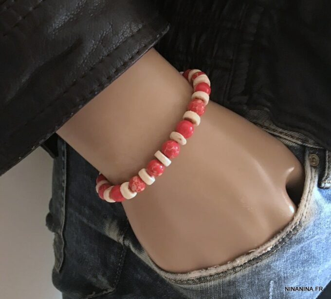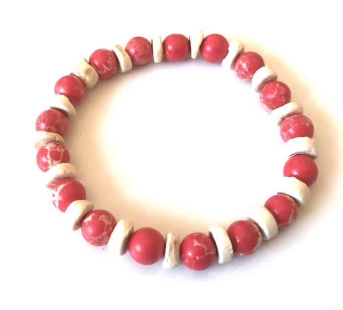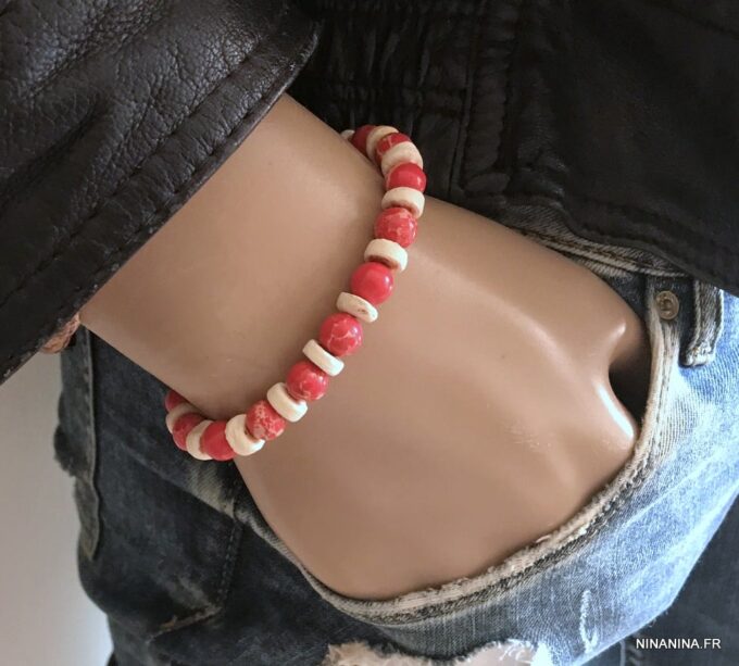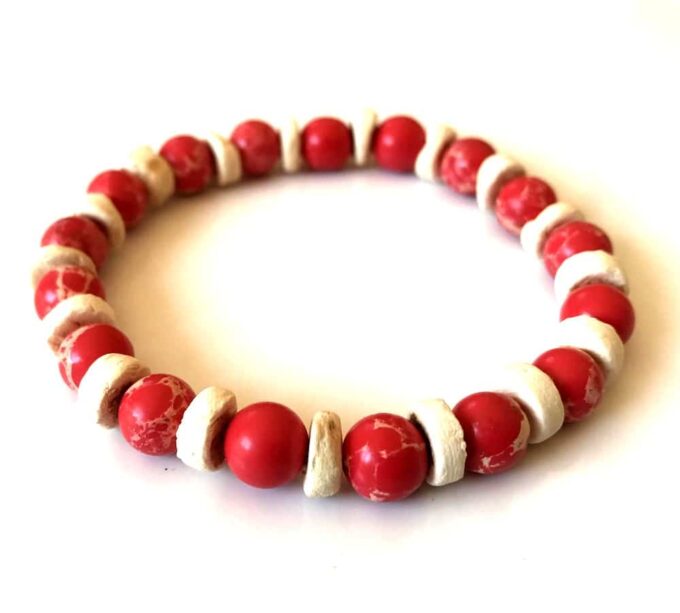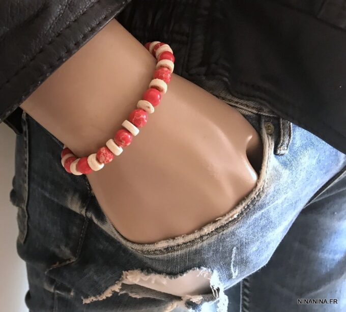 Faites des envieux avec ce Bracelet jaspe rouge et perles bois blanc pour homme composé de perles rondes en jaspe rouge et des rondelles de bois blanches de 8mm de diamètre montées en alternance sur un lien elastique !