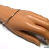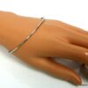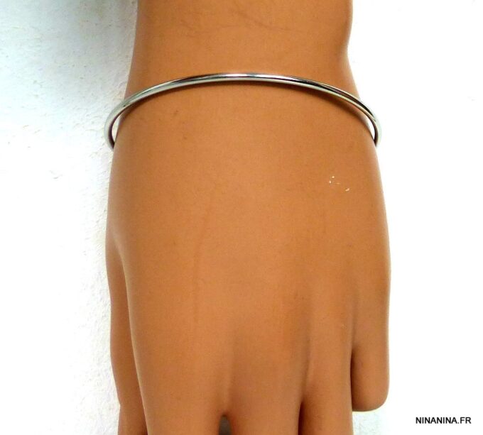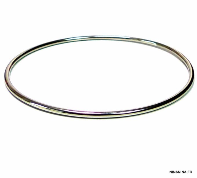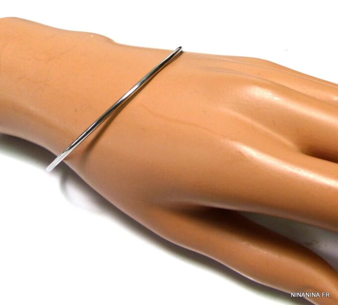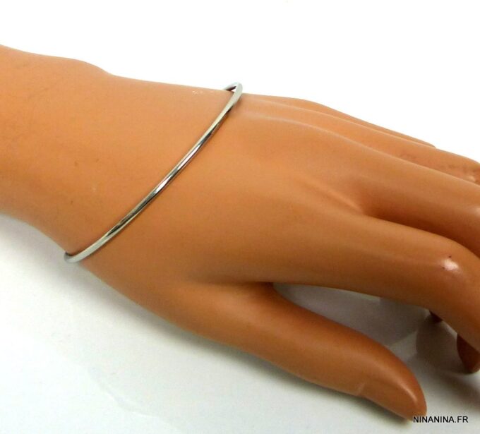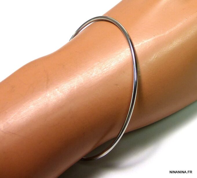 Bracelet jonc fin acier inoxydable argenté. Diamètre : 6,5 cm. Epaisseur : 0,2 cm. Livré dans sa pochette d’organza.