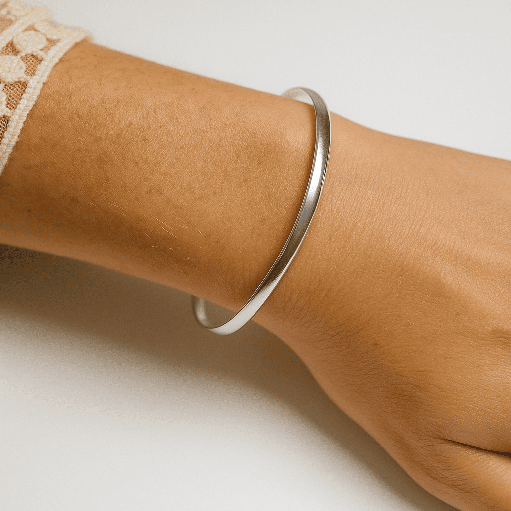 Jonc argenté fin pour femme en acier inoxydable. Bracelet fil plat élégant, résistant à l’eau et intemporel.