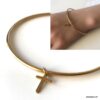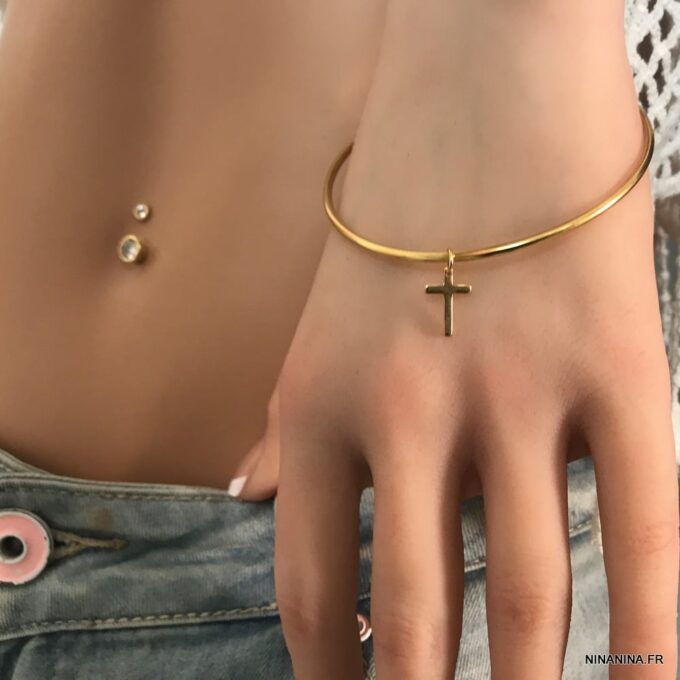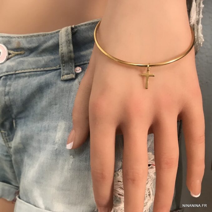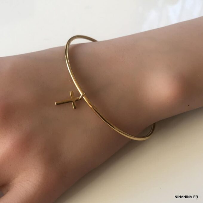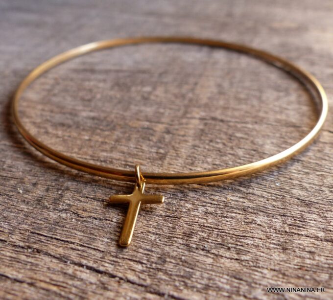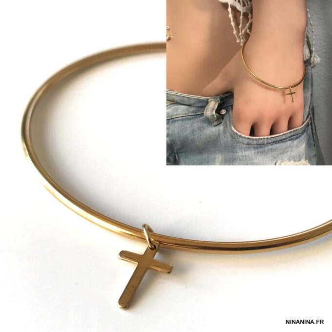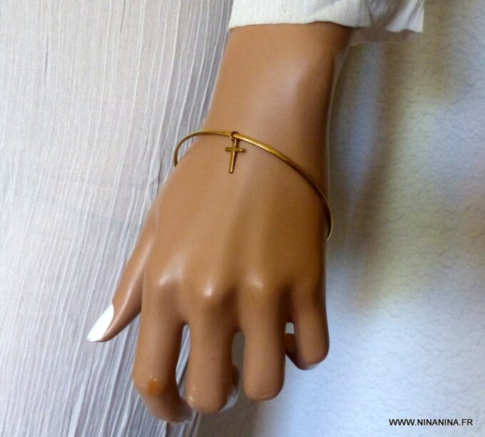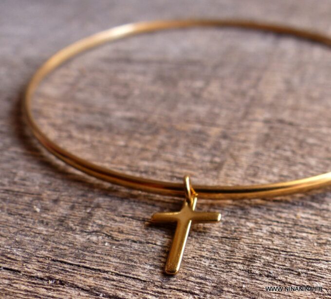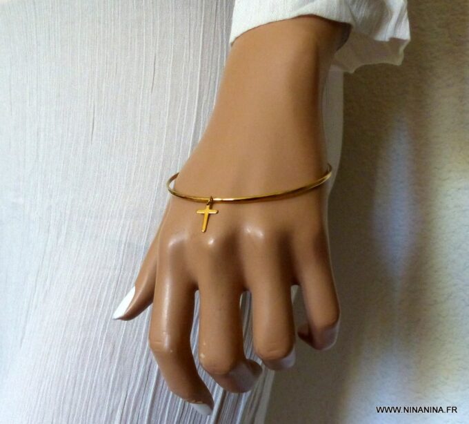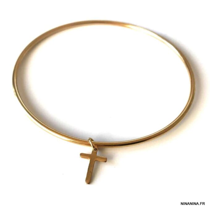Jonc croix Acier inoxydable doré fil rond femme composé d’un pendentif croix en acier inoxydable doré monté sur un jonc en acier inoxydable doré fil rond.