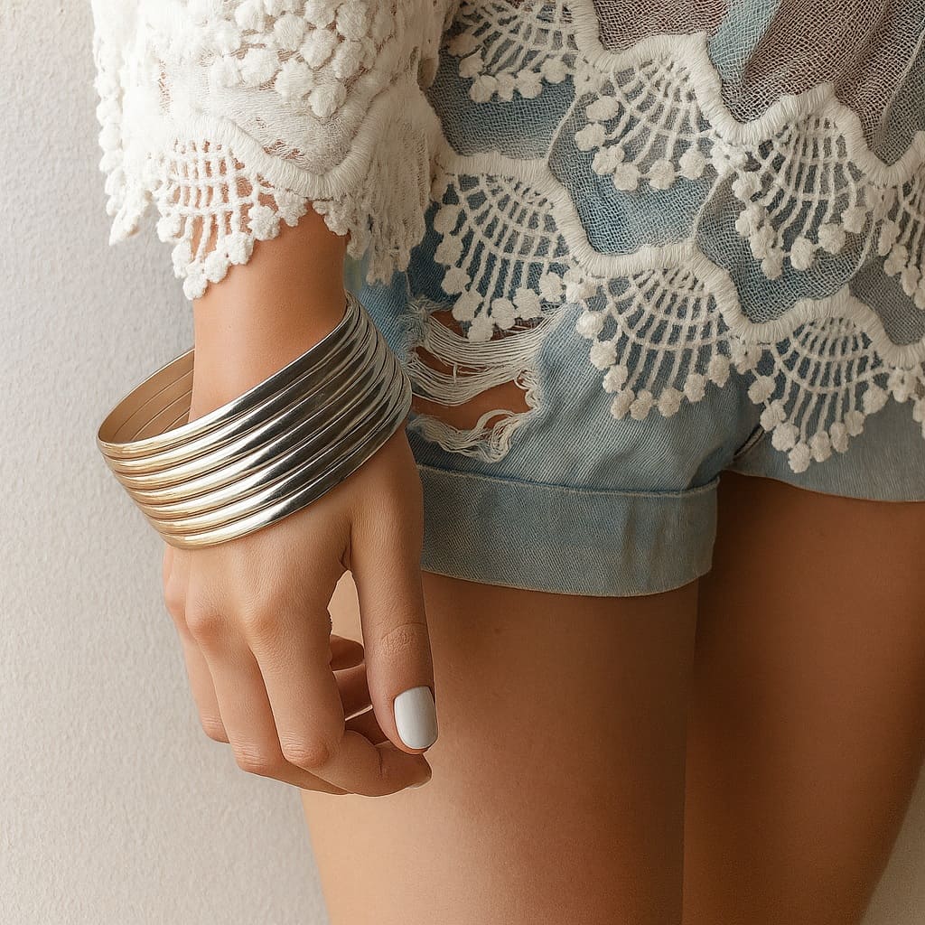 En accumulation : avec d’autres bracelets fins, en cuir ou avec des perles pour un look plus bohème.