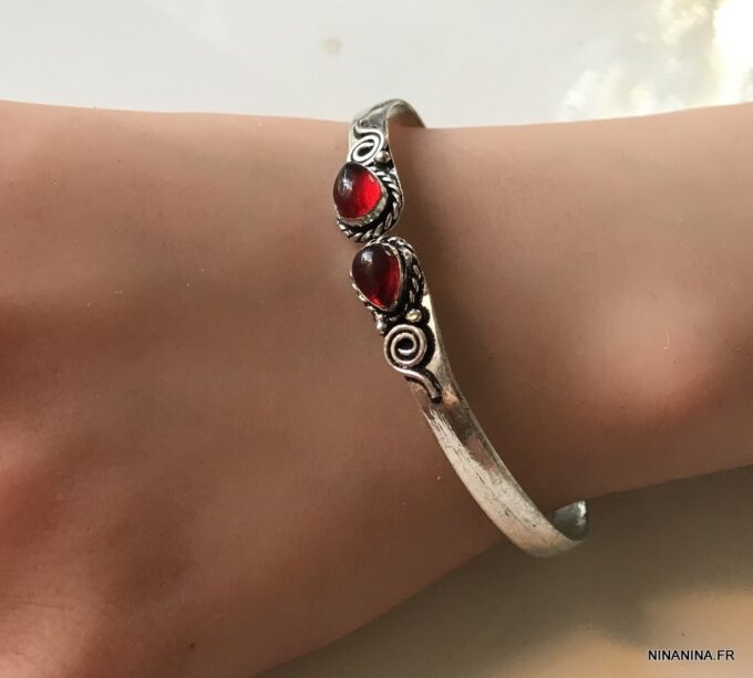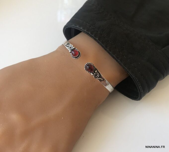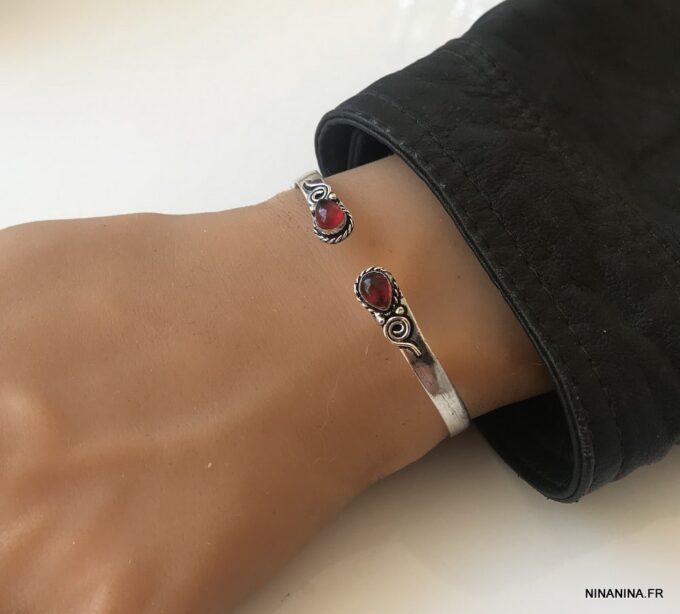Mi-chemin entre le jonc et la manchette pour ce Bracelet jonc pierre semi précieuse Grenat Rouge ! Ce bracelet jonc plat rigide en plaqué argent est incrusté de pierres en grenat rouge, large de 5mm et ouvert pour permettre un parfait ajustement en fonction de la taille de votre poignet.