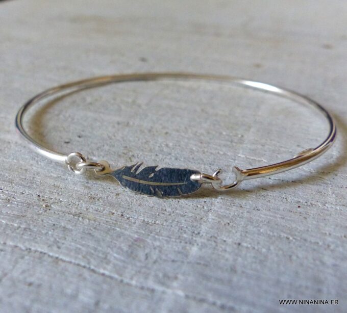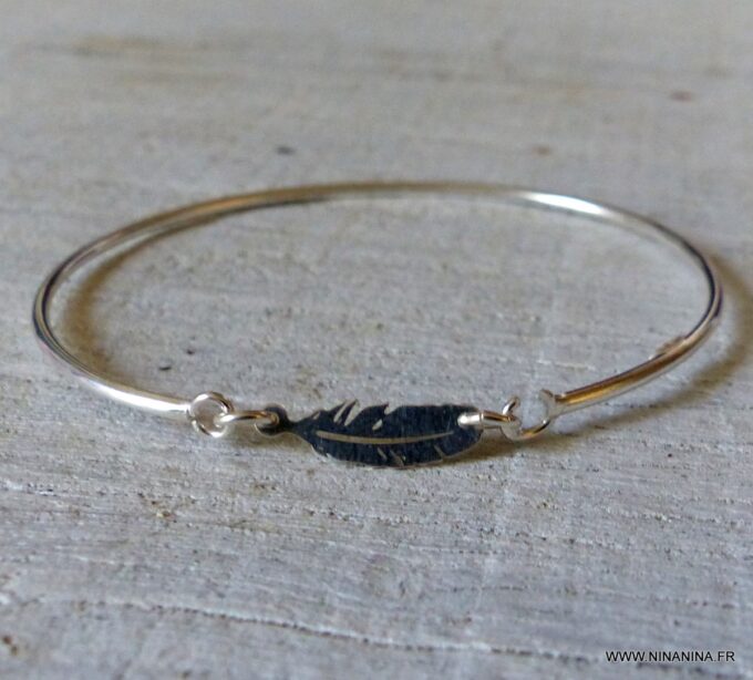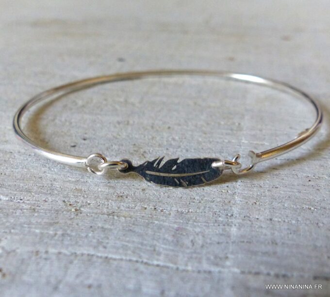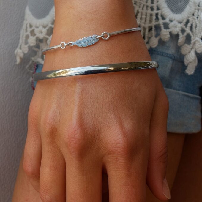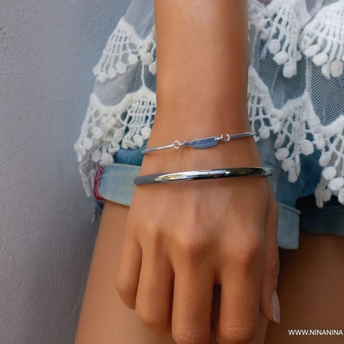 Ce bracelet plume argent se porte seul pour une allure délicate, ou accompagné d’autres joncs et bracelets argent Ninanina pour un look moderne et superposé.