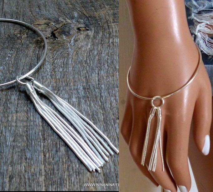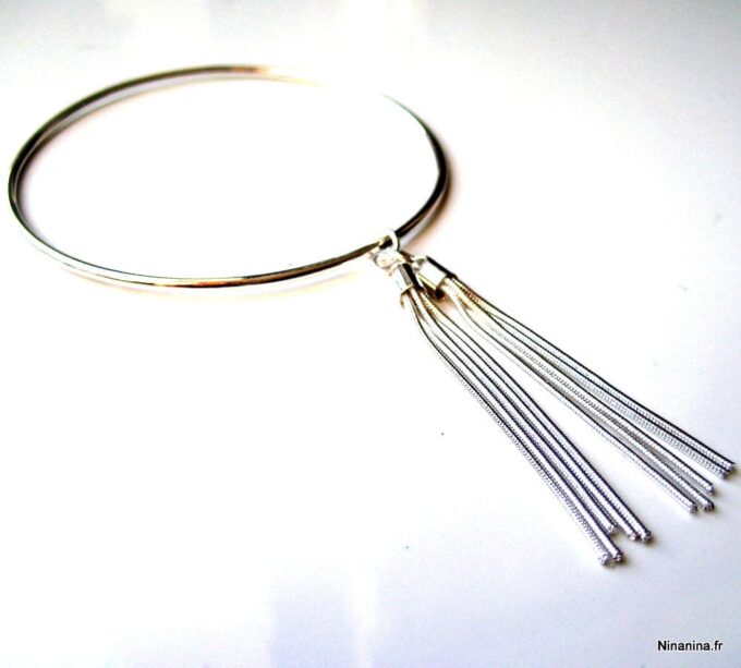 Ce Bracelet jonc pompon plaqué Argent de grande qualité est unique et fabriqué à la main, de façon artisanale dans notre atelier du sud de la France. Il s’agit d’un Bracelet jonc femme fait sur mesure qui convient pour des poignets de moins de 20 cm de circonférence. Le diamètre est de 7 cm. Epaisseur du fil : 1,5 mm. Longueur des pompons : 5,5 cm. Poids : 5 g