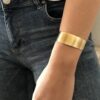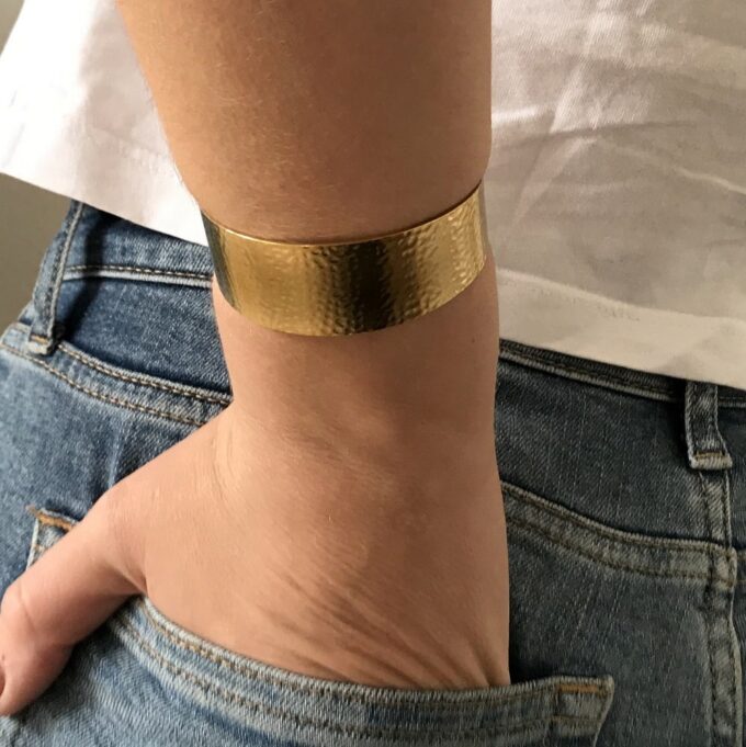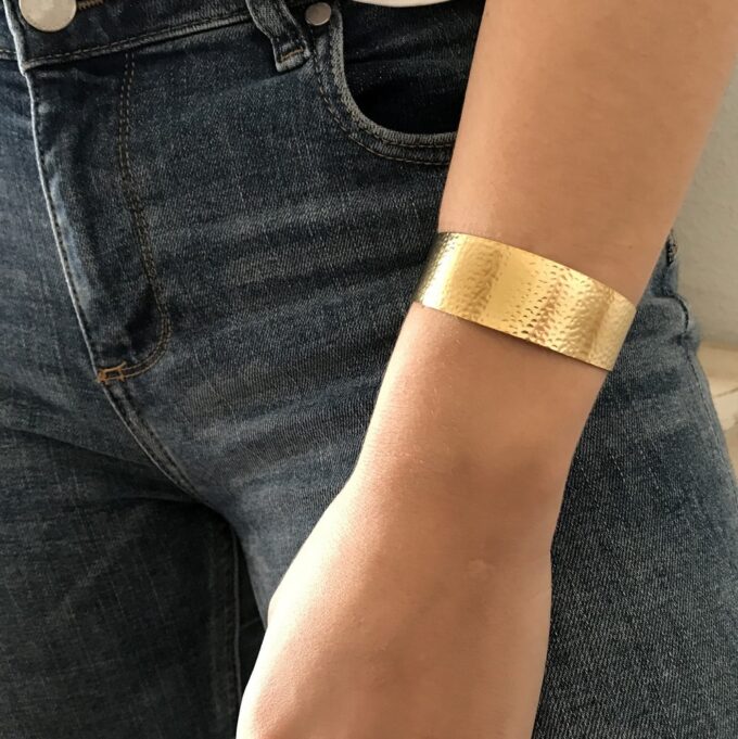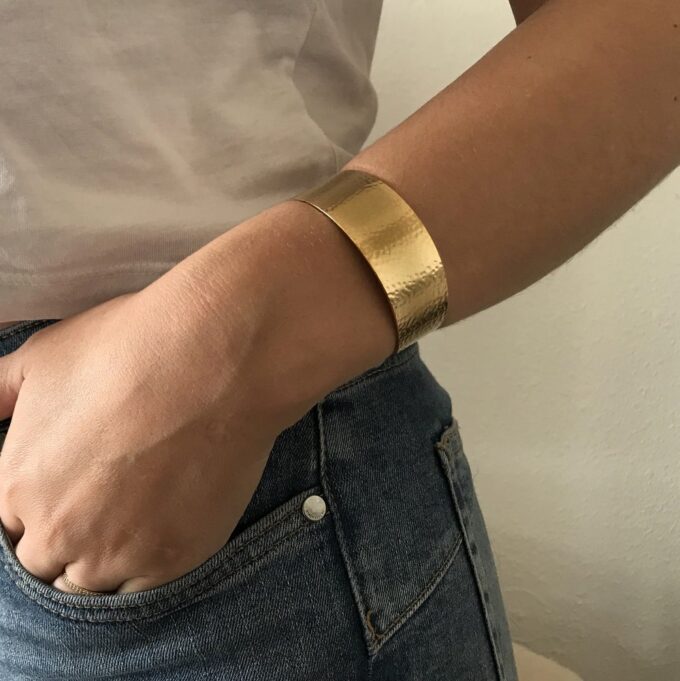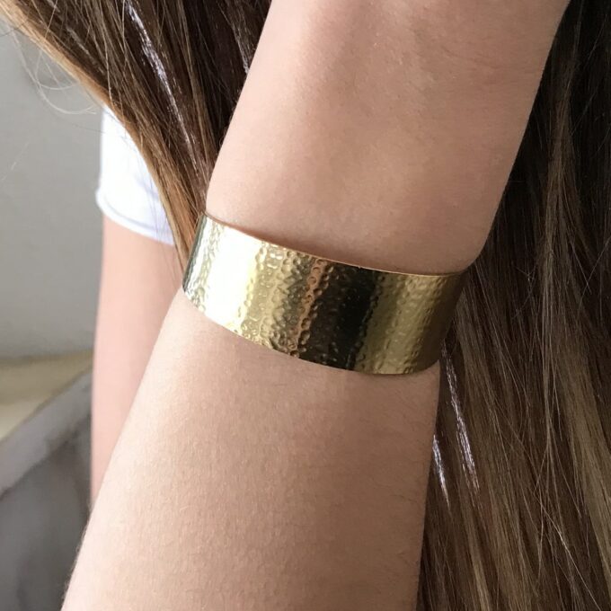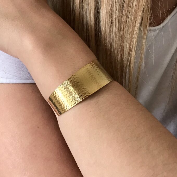 Festif, avec un aspect brillant qui captive le regard, ce Bracelet Large Femme Manchette Acier martelé doré est élégant et robuste.