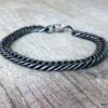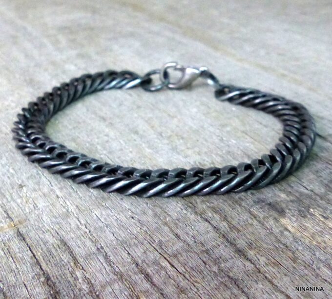 Bracelet maille gourmette métal noir gunblack. Largeur : 8 mm. Longueur (fermoir compris) : 21 cm (homme) et 19 cm (femme). (TOUTE AUTRE TAILLE POSSIBLE). Fermoir mousqueton. Livré dans sa pochette d’organza. ?