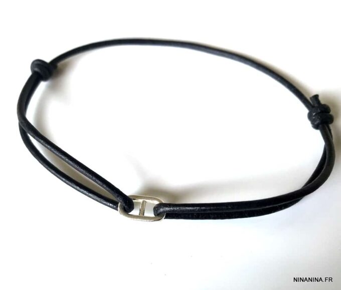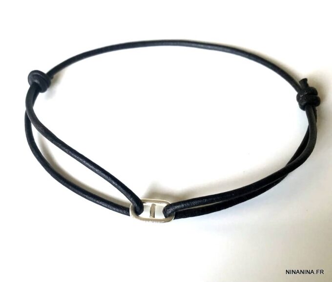 Découvrez vite ce Bracelet maille marine Argent homme cordon cuir réglable composé d’un anneau rond en plaqué argent monté sur un cordon de cuir noir de 2 mm de diamètre à liens coulissants. Ce Bracelet cordon cuir homme ou femme est proposé à un prix mini et existe en plusieurs couleurs : noir, marron foncé, rouge, bleu ciel et naturel à choisir dans le menu déroulant.
