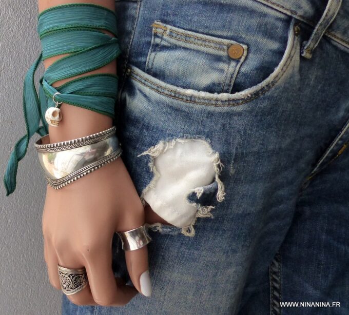 Bracelet en soie lavée breloque tête de mort turquoise