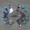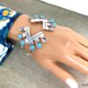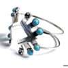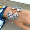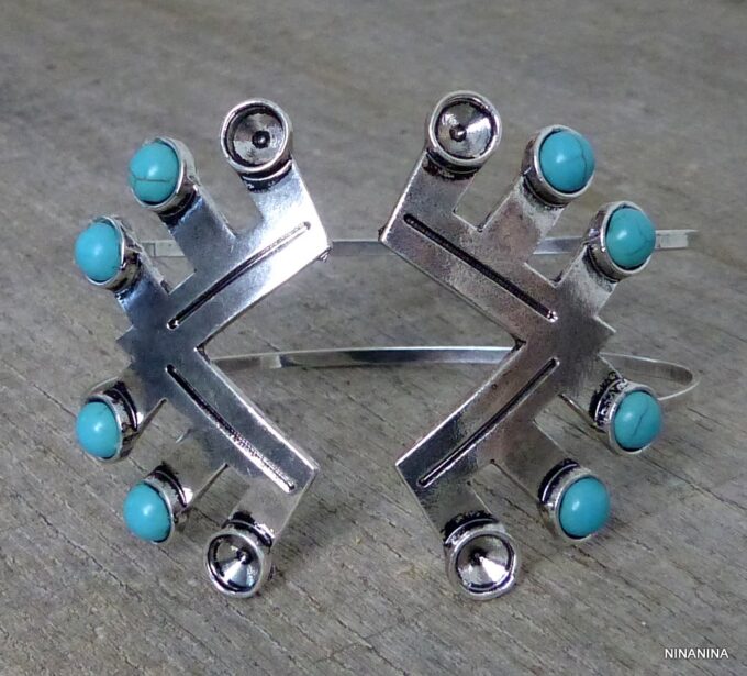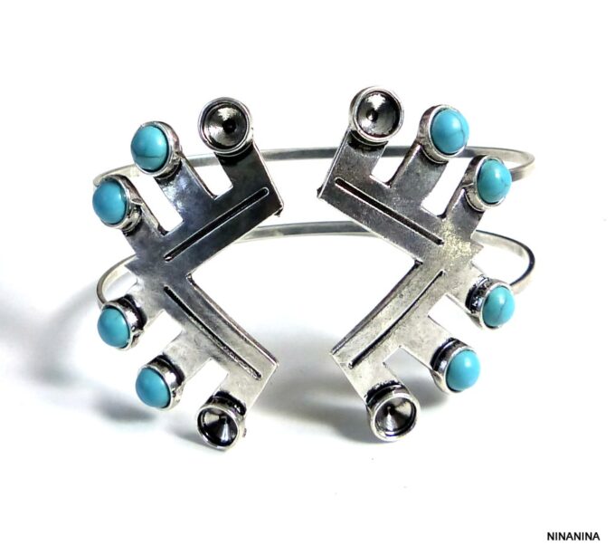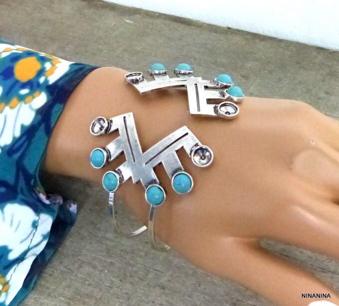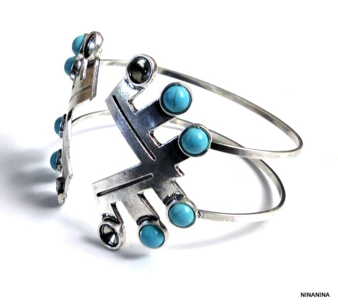 Bracelet manchette bohème métal argenté howlite turquoise. Hauteur : 5,2 cm. Diamètre : 6,5 cm réglable. Epaisseur : 0,3 env. Livré dans sa pochette d’organza.