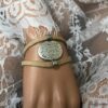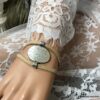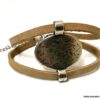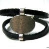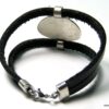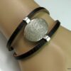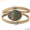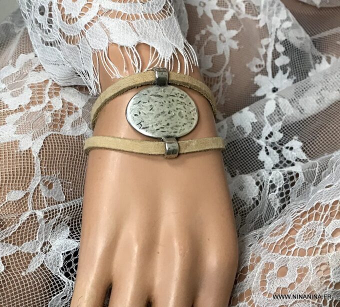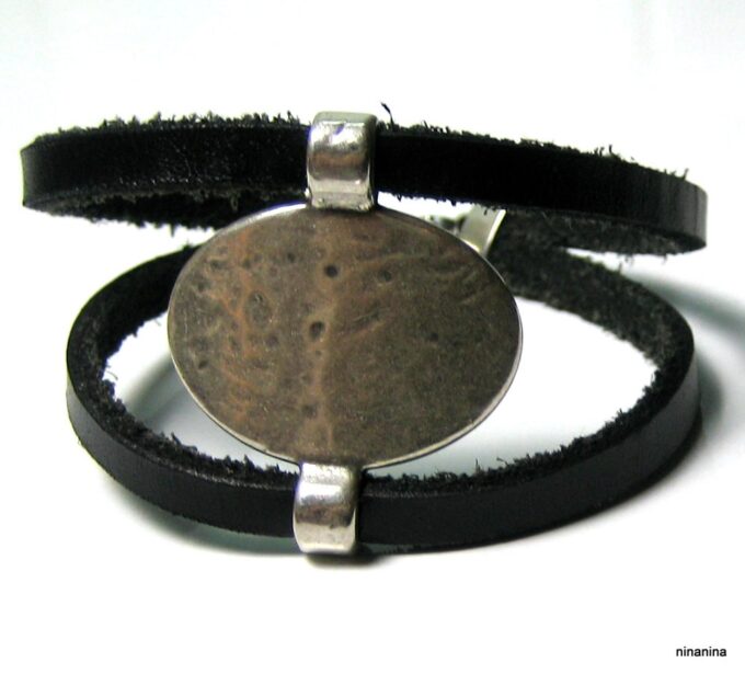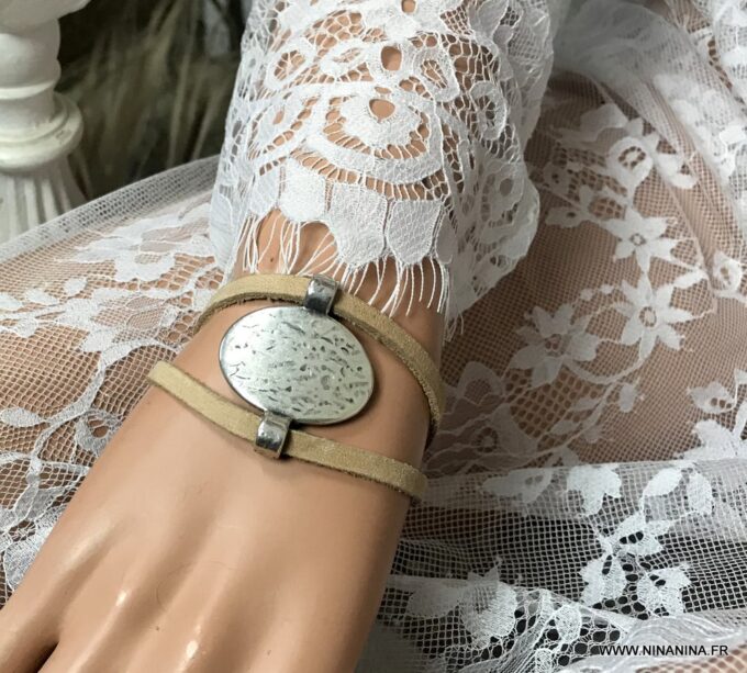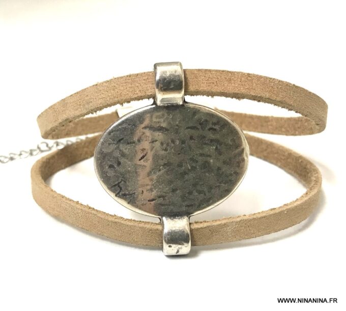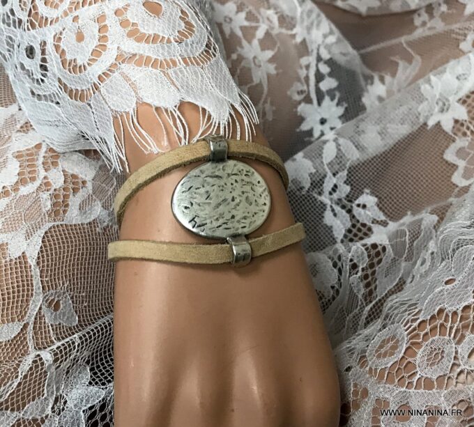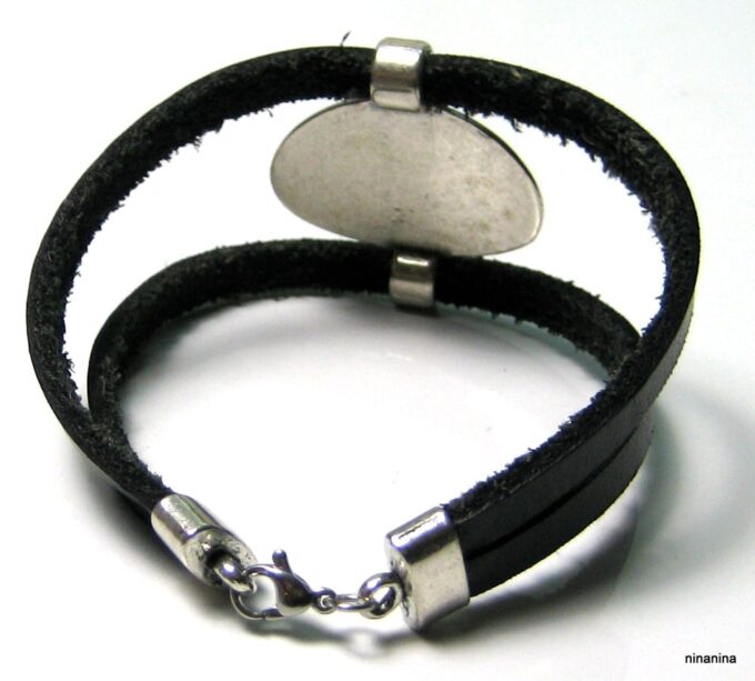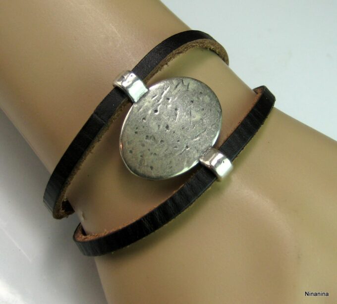 Bracelet manchette original femme cuir et métal argenté composé d’un connecteur ovale en métal argenté entouré de deux lanières de cuir naturel (0,5 cm de large) relié par des embouts en métal argenté.