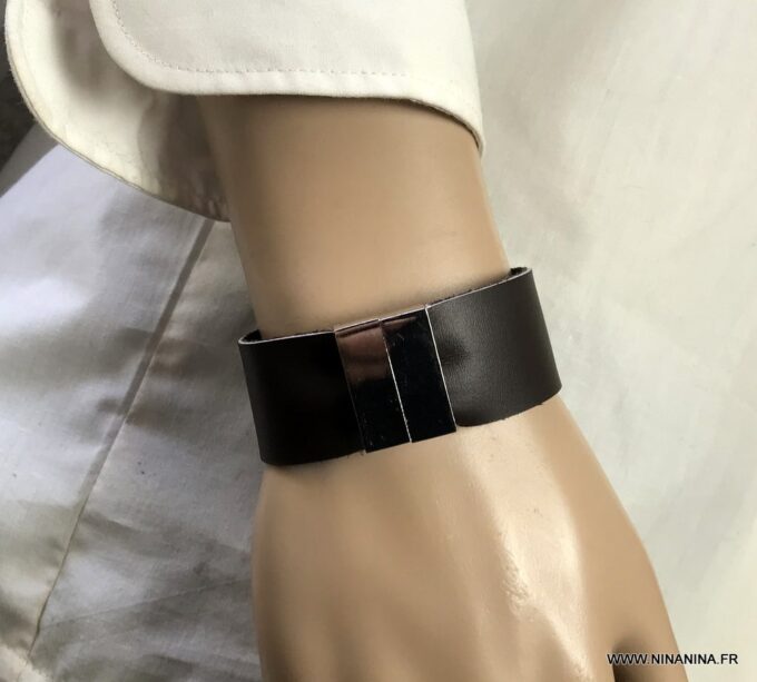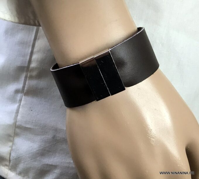 Bracelet manchette cuir femme ou homme fermoir aimanté composé d’un bandeau de cuir marron chocolat monté sur un large fermoir aimanté.
