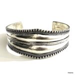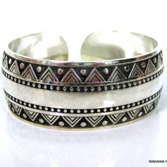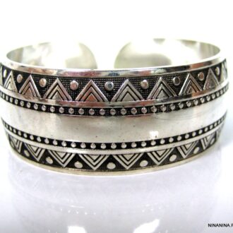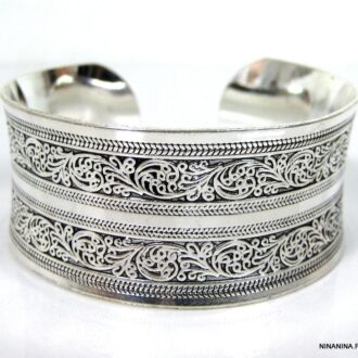 Bracelet manchette artisanal orné de lapis lazuli, corail et aiguemarine. Largeur : 1,3 cm. Longueur : 17 cm ajustable. S’adapte à tous les poignets. Livré dans sa pochette d’organza.