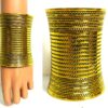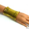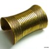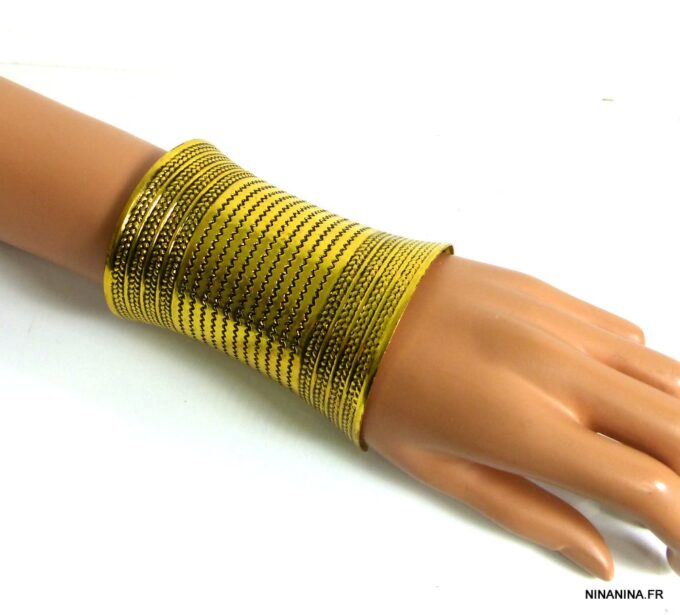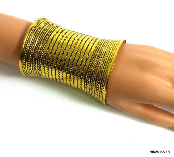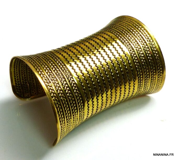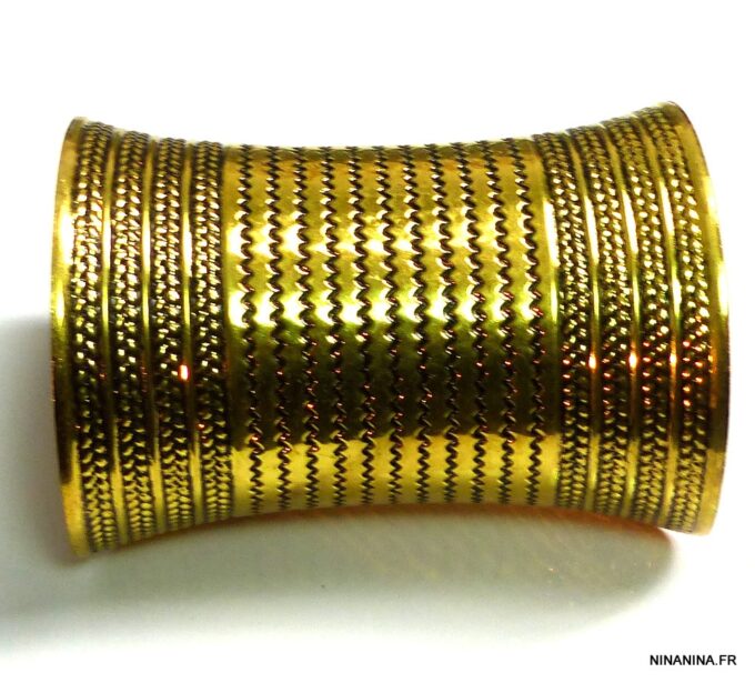 Bracelet manchette large en métal doré. Diamètre : 6,5 cm environ réglable. Largeur : 10 cm env. Livré dans sa pochette d’organza.
