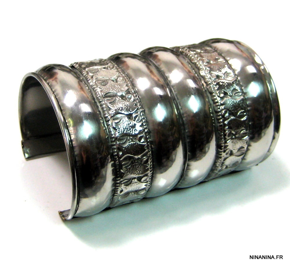 Manchette indienne extra large en métal argenté bombé filigrané. Fabrication artisanale. Possibilités de petites imperfections dues au travail artisanal. Diamètre : 6cm environ réglable. Largeur : 10 cm. Livré dans sa pochette d’organza. Poids : 42,9 g