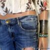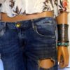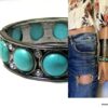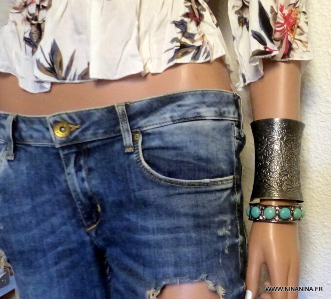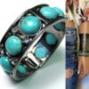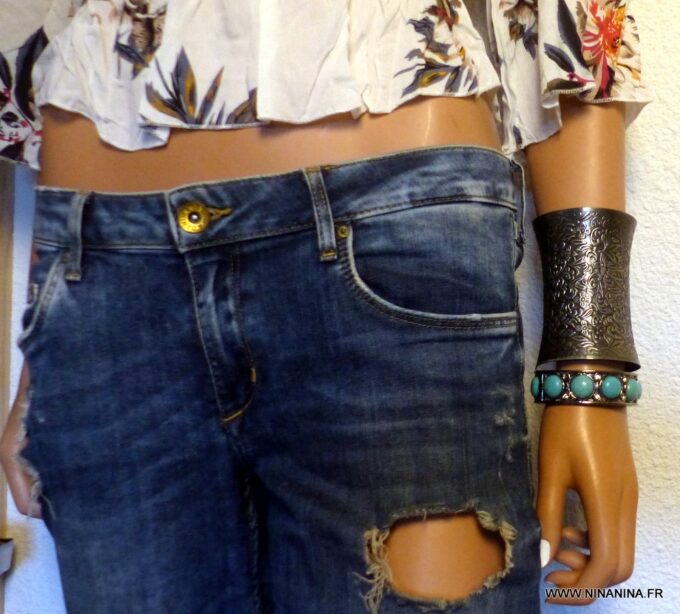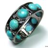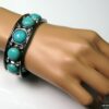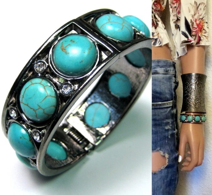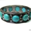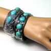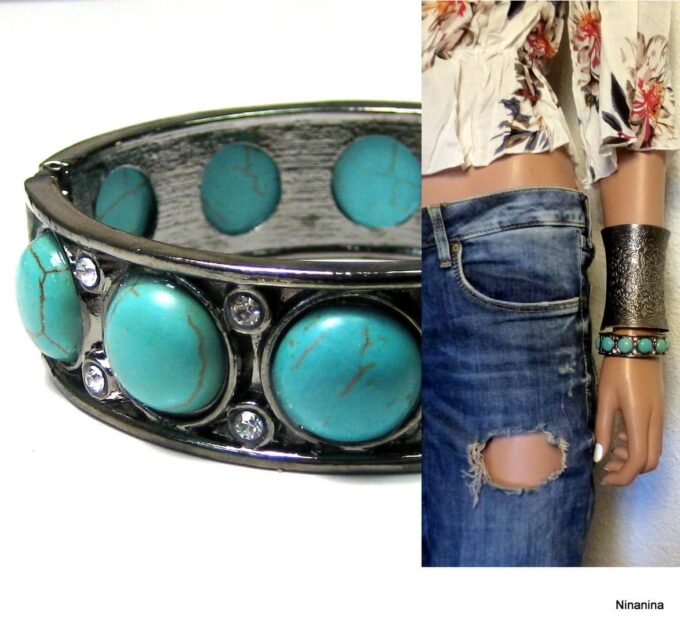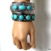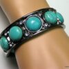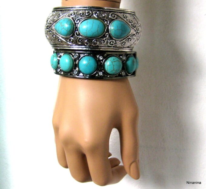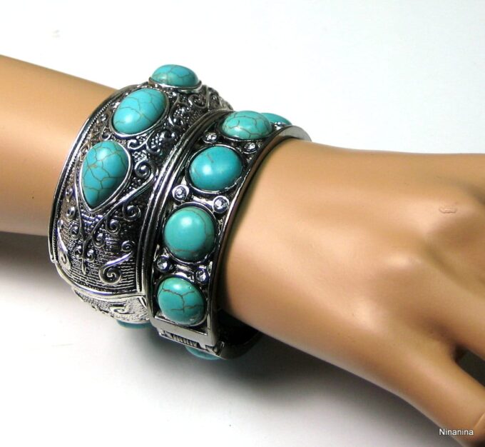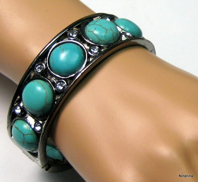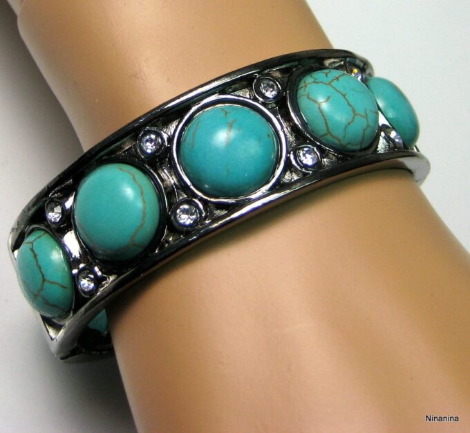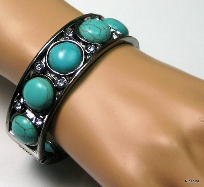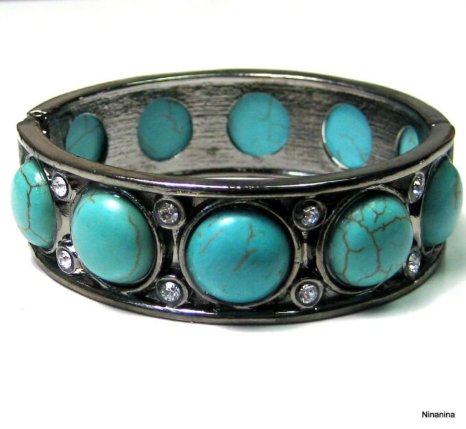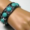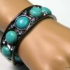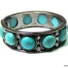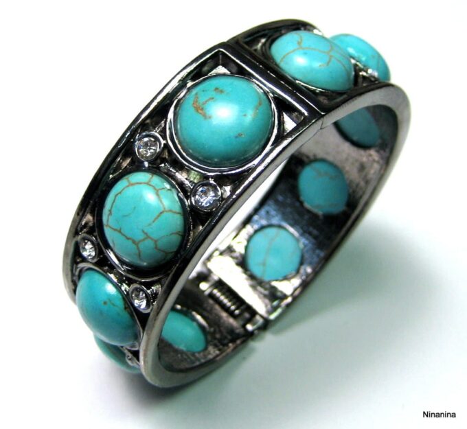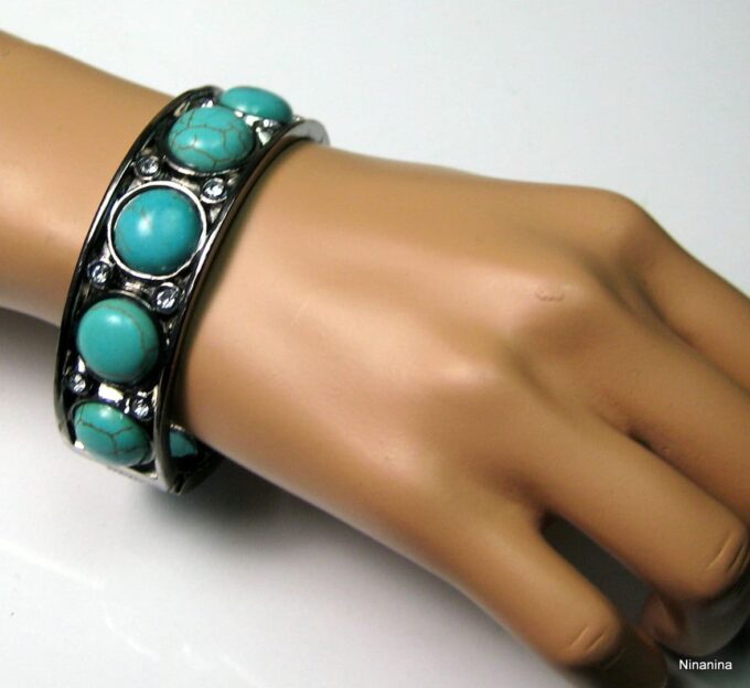 Bracelet manchette en métal argenté incrusté de cabochons ronds de magnésite turquoise. Diamètre intérieur : 5,8 cm réglable. Fermeture charnière. Largeur : 2 cm. Livré dans sa pochette d’organza.