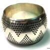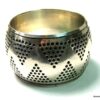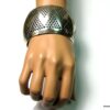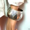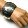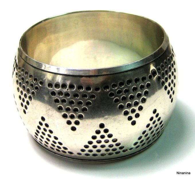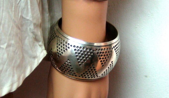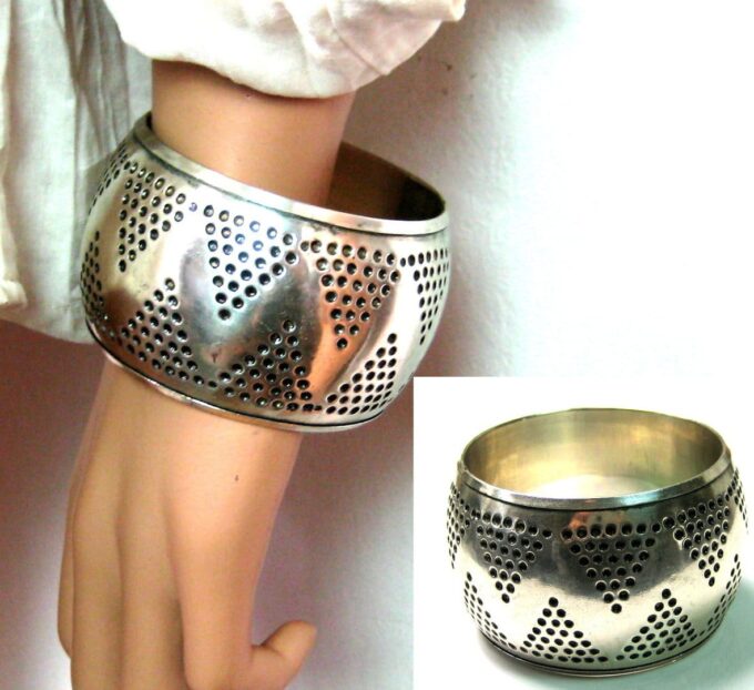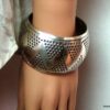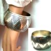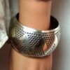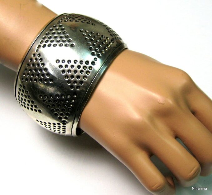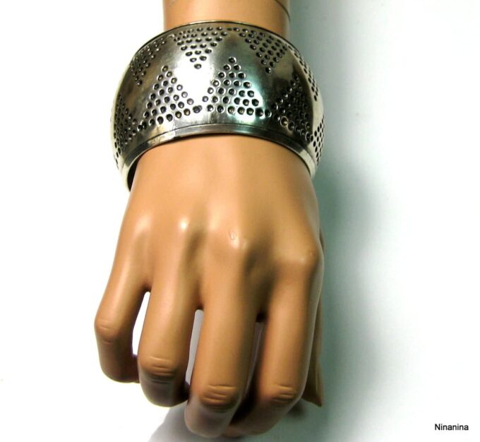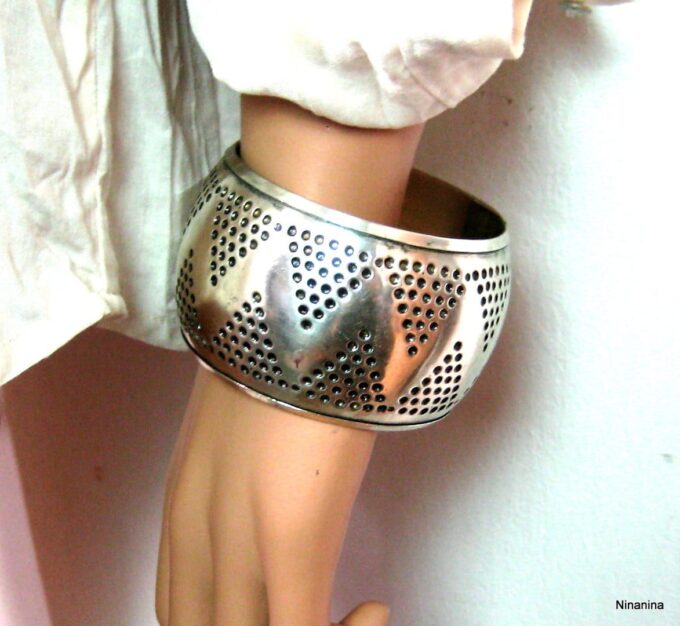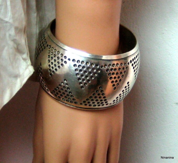 Bracelet manchette en métal argenté vieilli. Diamètre intérieur : 6,8 cm. Largeur : 5 cm env. Livré dans sa pochette d’organza.