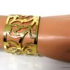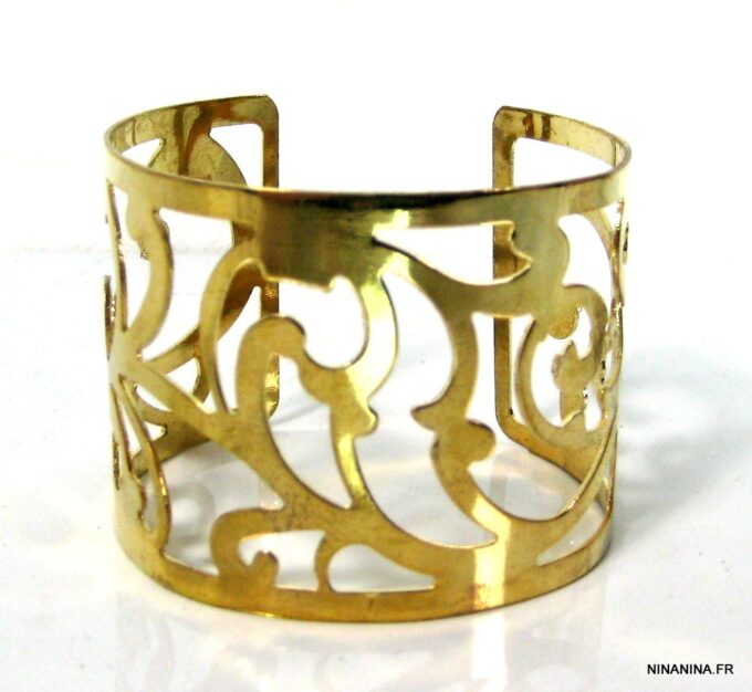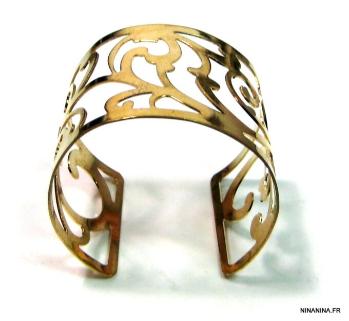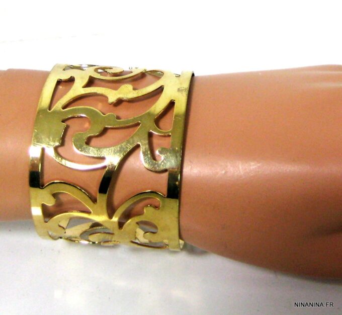 Bracelet Manchette femme métal doré filigrané. Diamètre : 5,5 cm environ réglable. Largeur : 4,5 cm. Livré dans sa pochette d’organza. Poids : 20,7 g