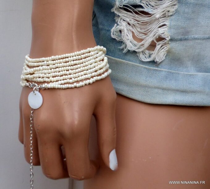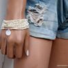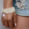 Offrez un look boho chic à votre poignet avec ce Bracelet wrap perles rocaille blanches et nacre composé d’un double rang de perles de rocailles blanches, d’une pastille en nacre blanc et terminé par un fermoir mousqueton en argent 925, à enrouler autour du poignet, qui vous accompagnera tout au long de l’été. Un bracelet wrap original et tendance que vous adorerez porter à la plage aussi bien qu’au bureau sur votre peau bronzée.
