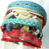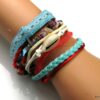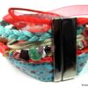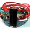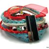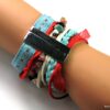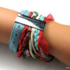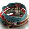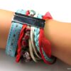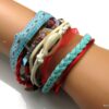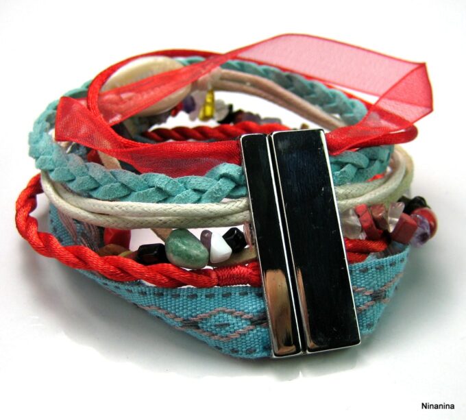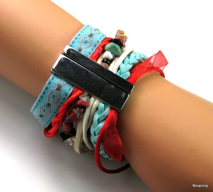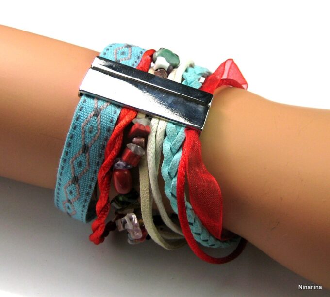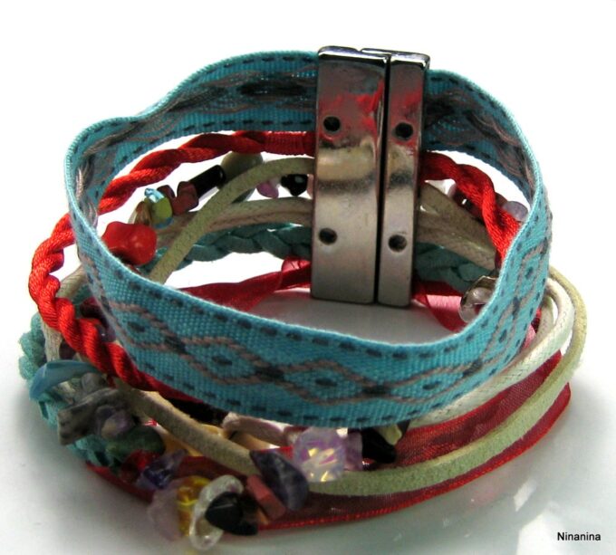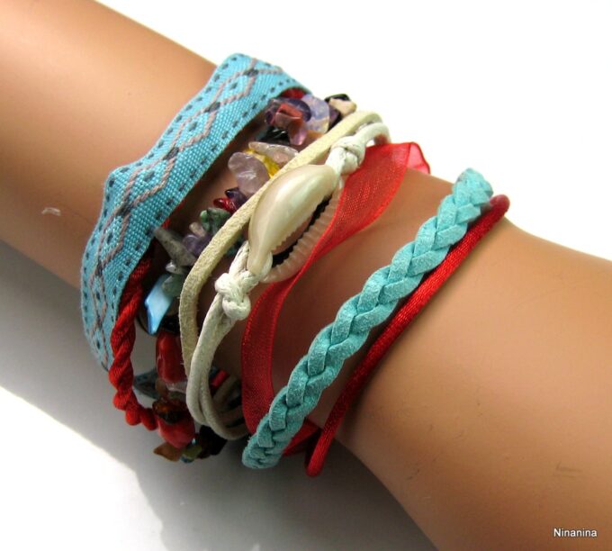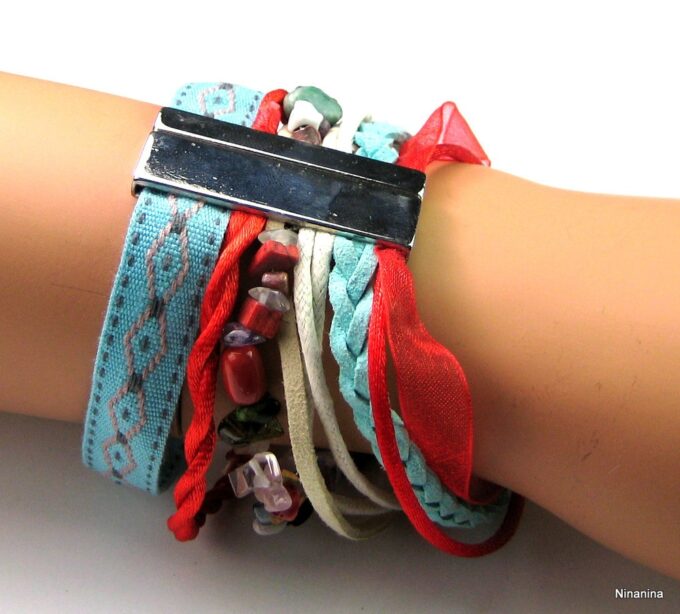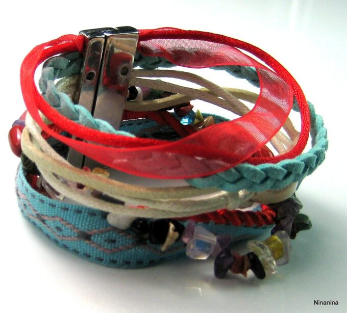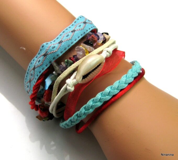Bracelet manchette type « HIPANEMA » composé de coquillages, de quartz multicolore et de liens en cuir, coton et organza montés sur un fermoir aimanté.