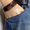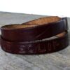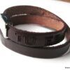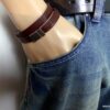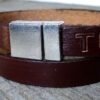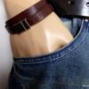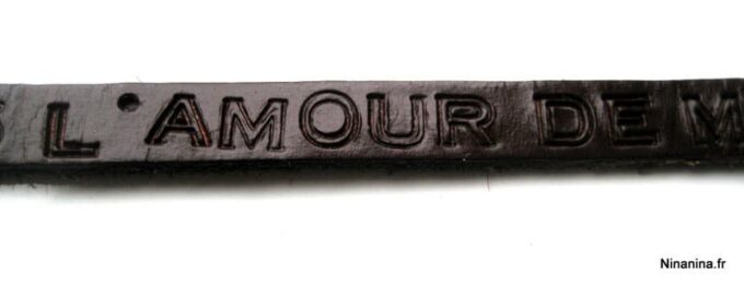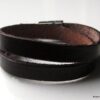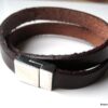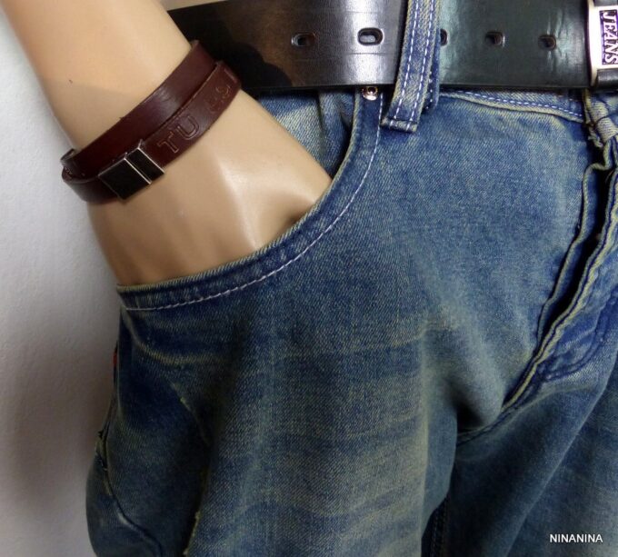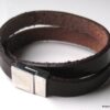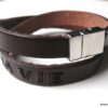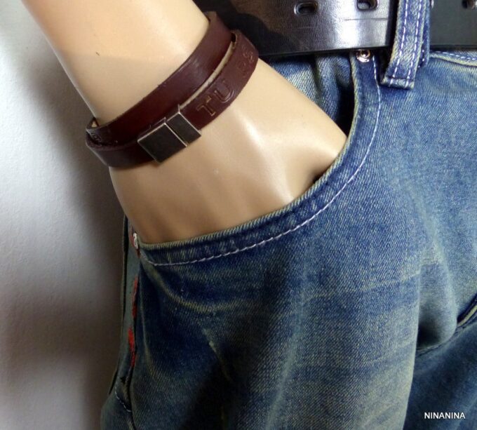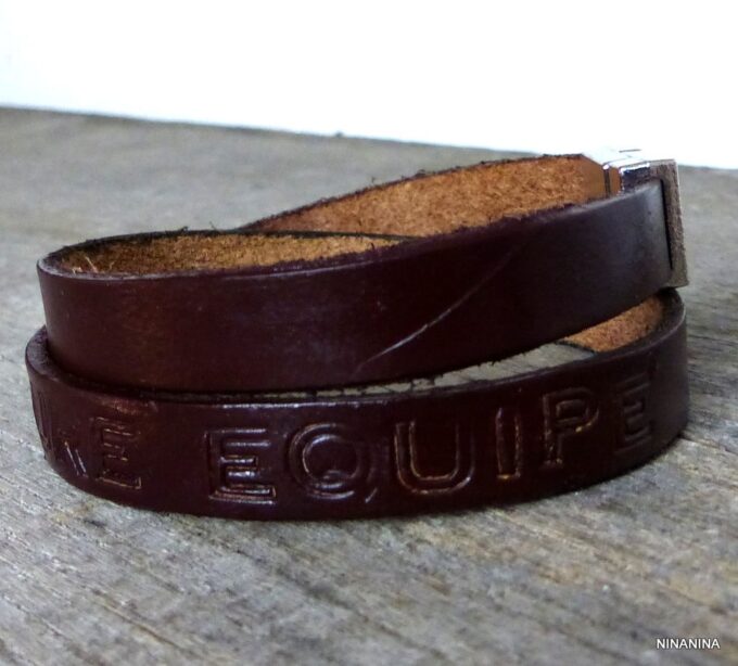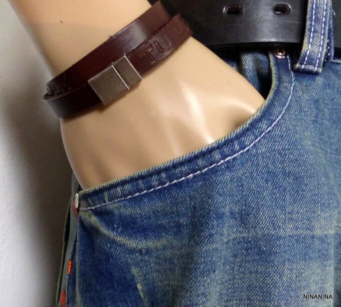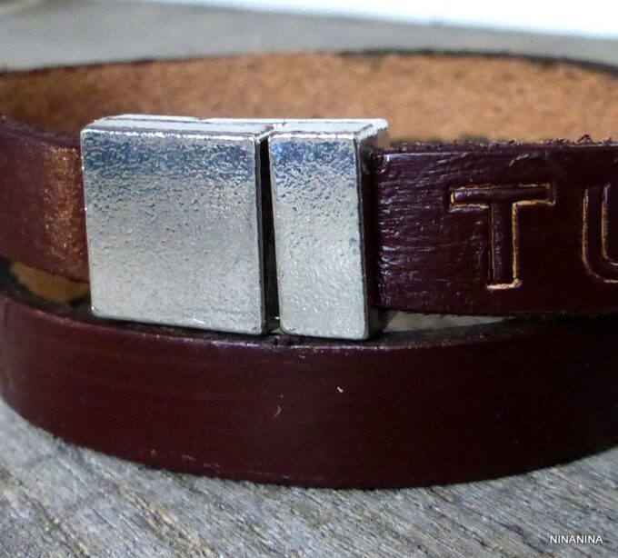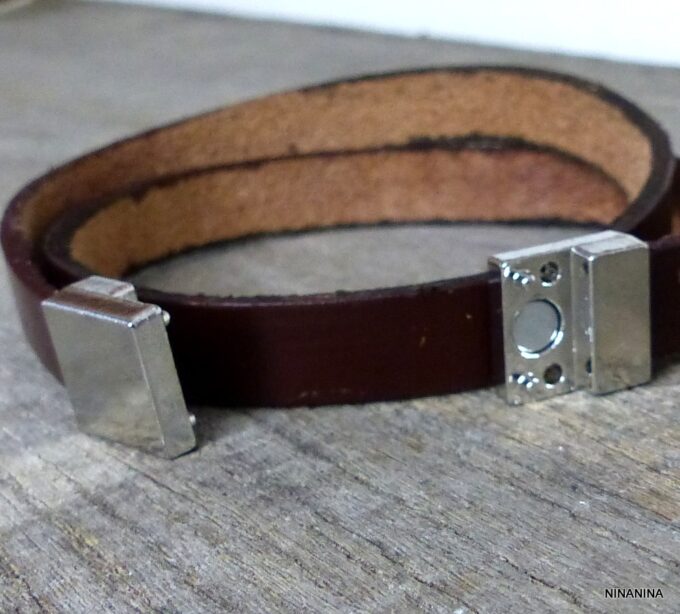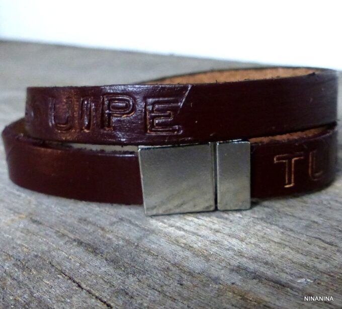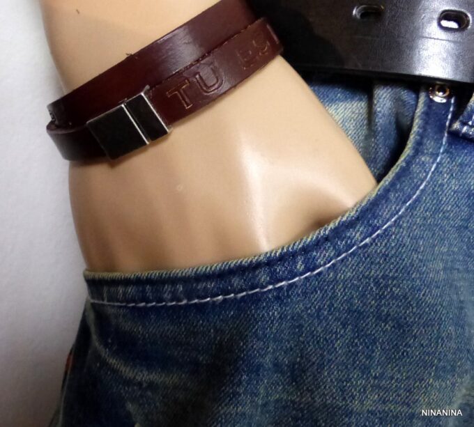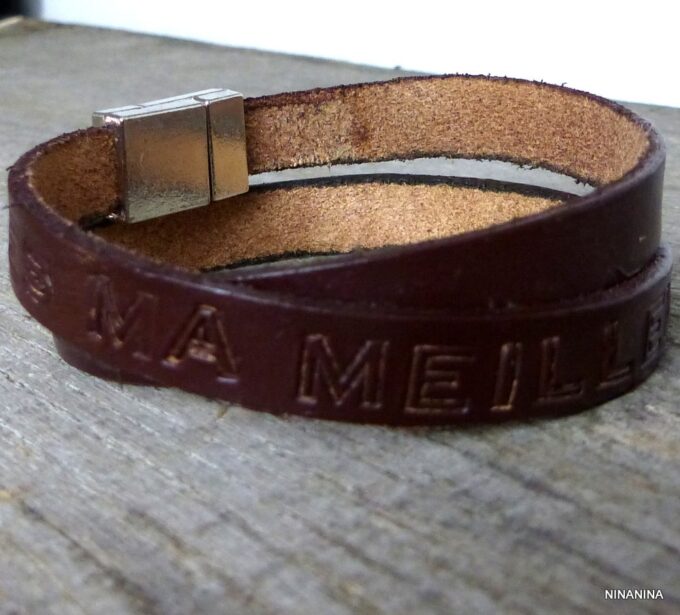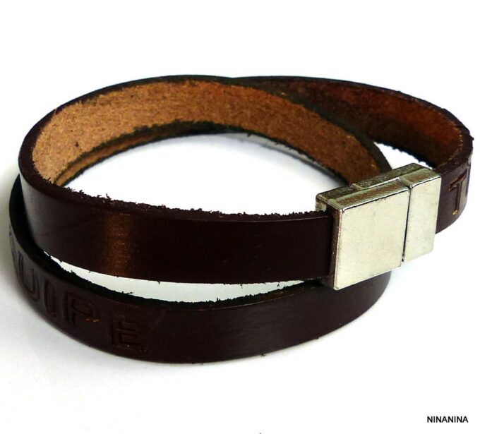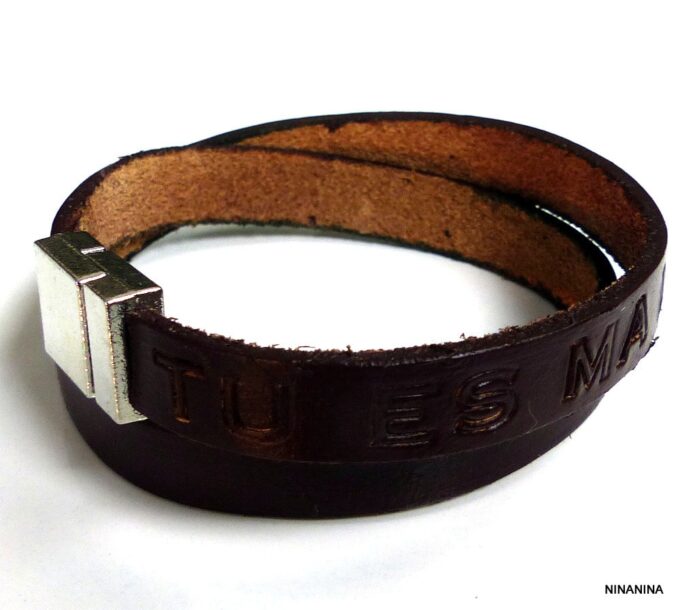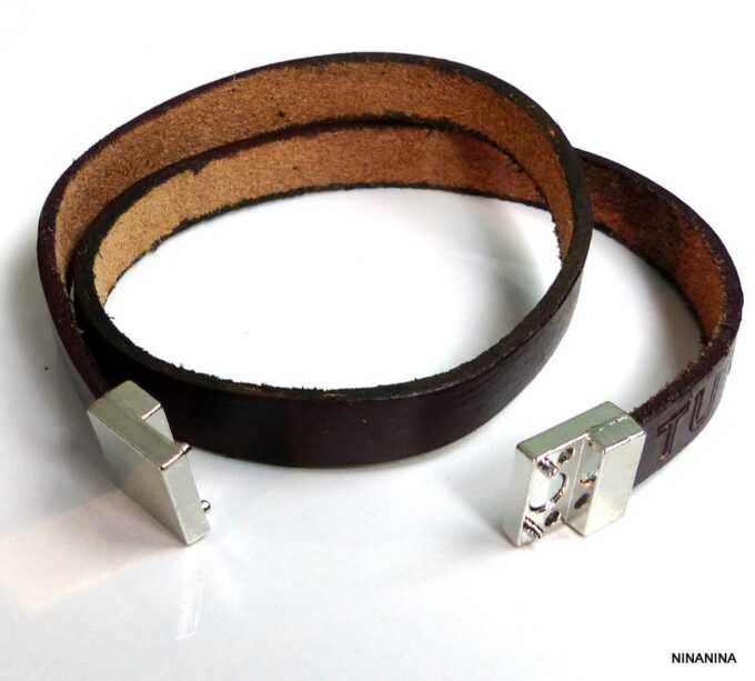 Bracelet message personnalisé homme cuir marron double tour composé d’un bandeau de cuir marron chocolat (1 cm de large) monté sur un fermoir aimanté rectangulaire en métal argenté. A personnaliser avec un mot, une date ou un prénom de votre choix. Longueur totale (fermoir compris): 41 cm (homme) et 39 cm (femme). TOUTE AUTRE LONGUEUR POSSIBLE – longueur souhaitée à indiquer en commentaire. Livré dans sa pochette d’organza. Bijou 100% fait main.