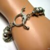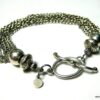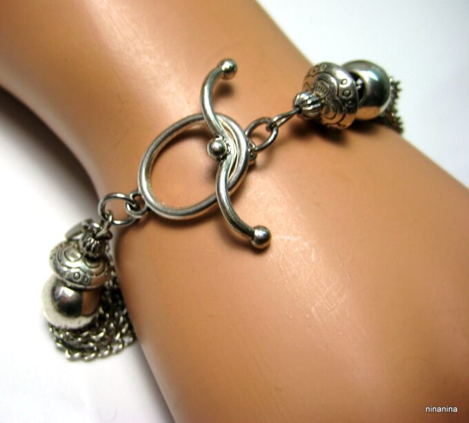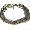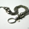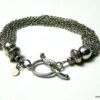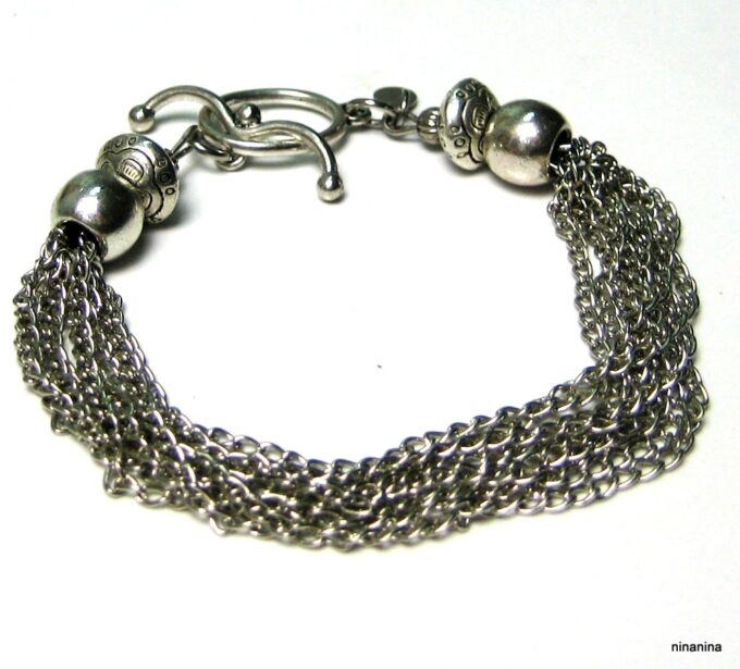 Bracelet chainettes métal argenté constitué de 9 chainettes en métal argenté terminées par deux grosses perles pandora et deux perles plates décorées en métal argenté. Dim des perles pandora : 1,2 X 0,8 cm env. Longueur (fermoir compris) : 19 cm env. Fermoir cheville ovale. Livré dans sa pochette d’organza.