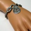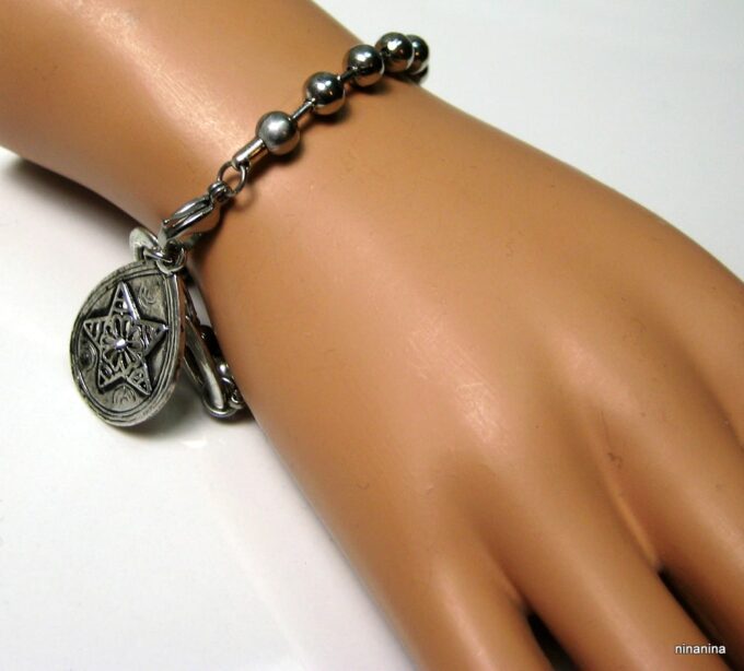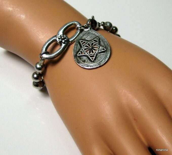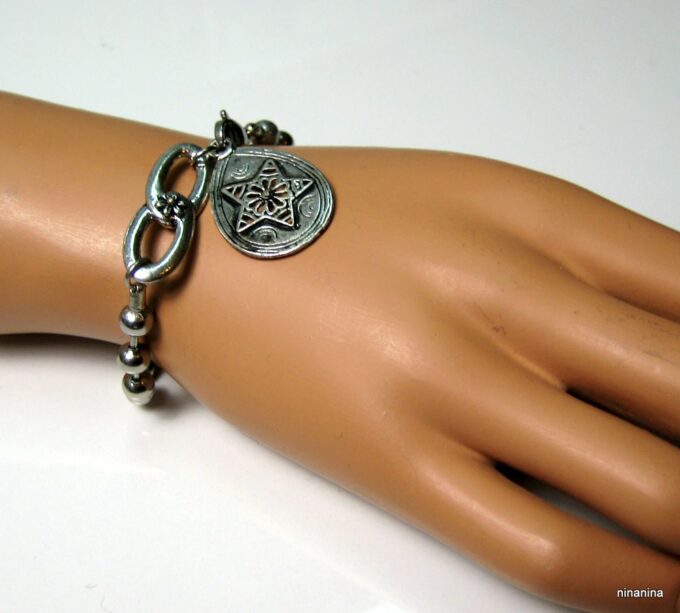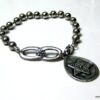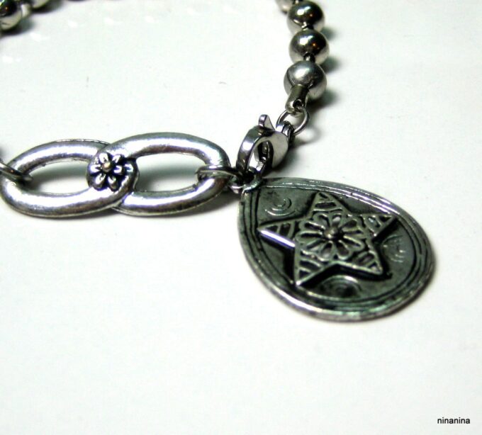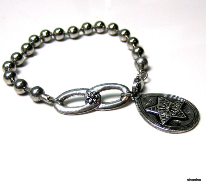 Bracelet boule métal argenté composé d’un pendentif en métal argenté monté sur chaine boule gros maillons. Longueur totale : 20 cm env. Livré dans sa pochette d’organza. Bijou 100% fait-main.