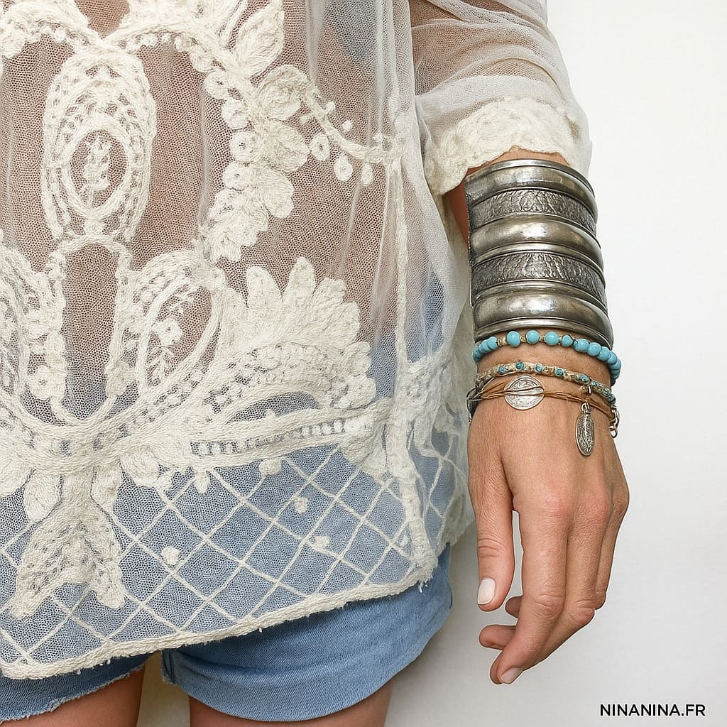 • En accumulation : associez-le à des bracelets en cuir ou en perles pour un look superposé tendance.