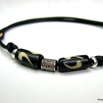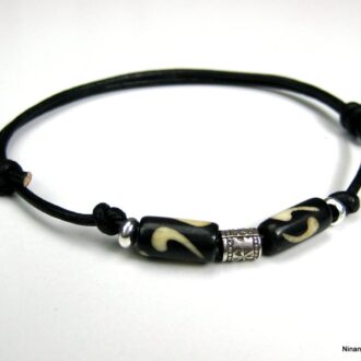 Bracelet homme cordon cuir argent massif et perles bois composé d’une perle cylindrique ciselée, de 2 rondelles en argent 925 et de 2 perles cylindriques en bois turquoise montées sur un double cordon de cuir.