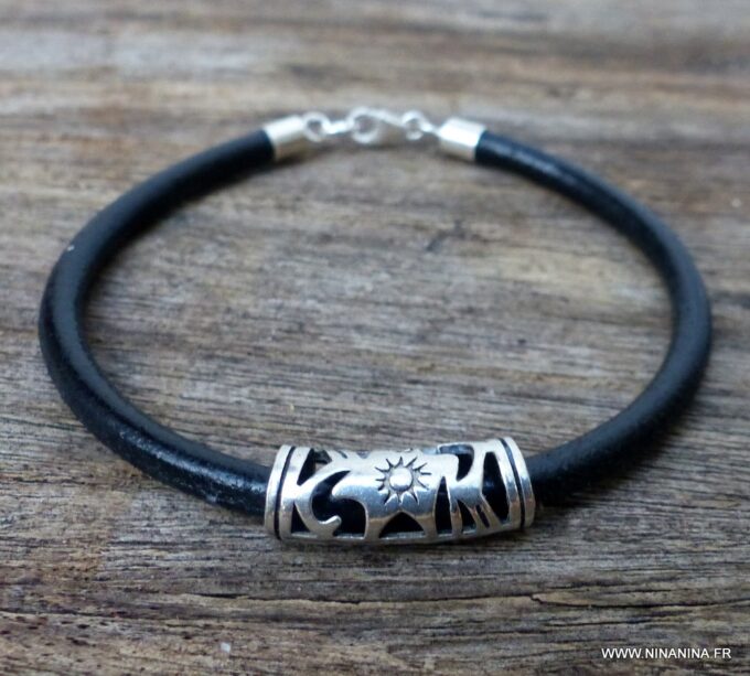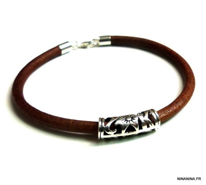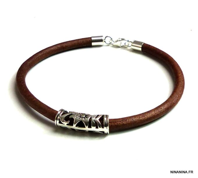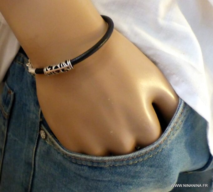 Bracelet cordon cuir perle tube argent massif composé d’une perle tube filigranée en argent 925 montée sur un cordon en cuir (4mm).
