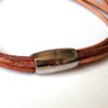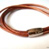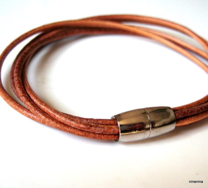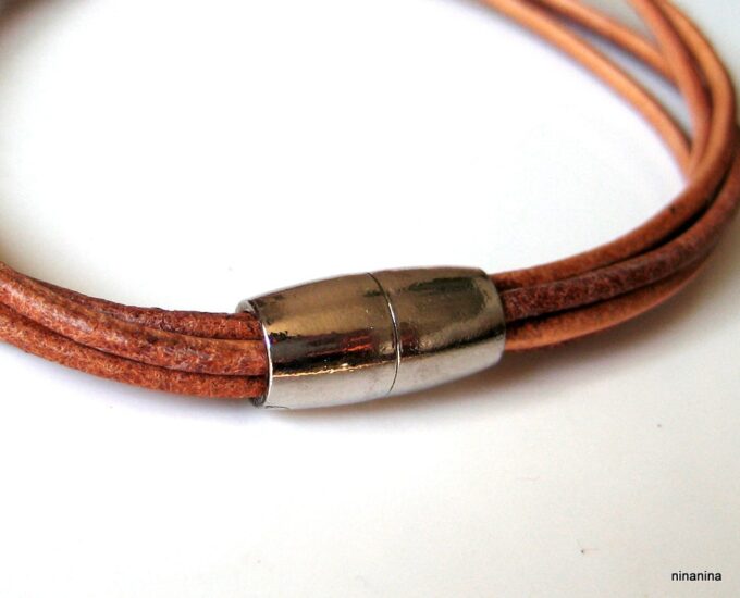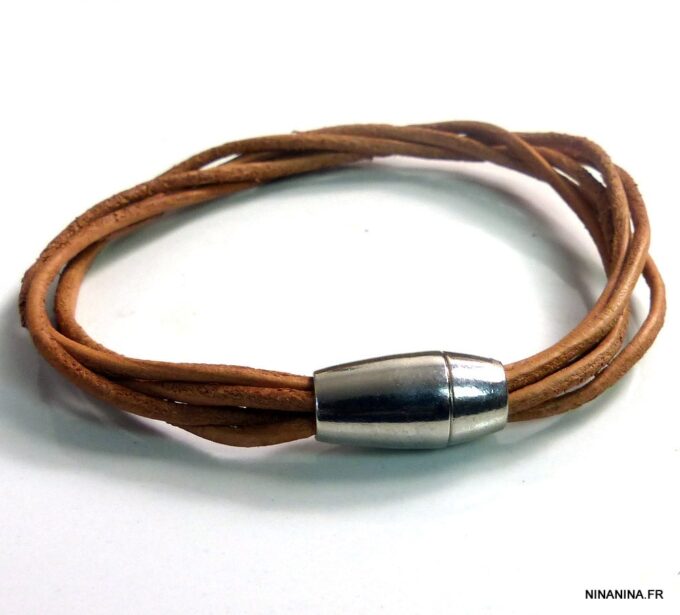 BBracelet multi liens cordon cuir naturel Acier argent composé de 5 cordons en cuir naturel montés sur un fermoir magnétique en acier inoxydable . Diamètre du cordon : 0,2 cm. Existe avec un cordon noir, marron chocolat, gris, turquoise, rose foncé, rouge et naturel. Fermeture par liens coulissants. Longueur : 21 cm env. Livré dans sa pochette d’organza. Bijou 100% fait main.