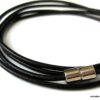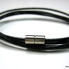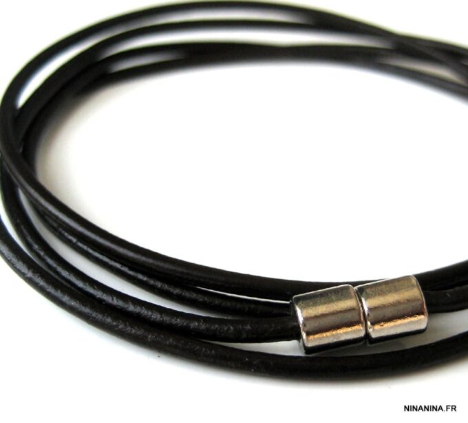 Bracelet cordon cuir composé d’un cordon de cuir noir (2 mm de diamètre) à enrouler autour du poignet (4 tours) terminé par un fermoir cylindrique aimanté en acier inoxydable. Existe aussi avec un cordon marron chocolat, turquoise, rose foncé, gris et naturel. Fermoir magnétique en acier inoxydable. Longueur : 82 cm (pour homme) et 76 cm (pour femme). Livré dans sa pochette d’organza. Bijou 100% fait main.