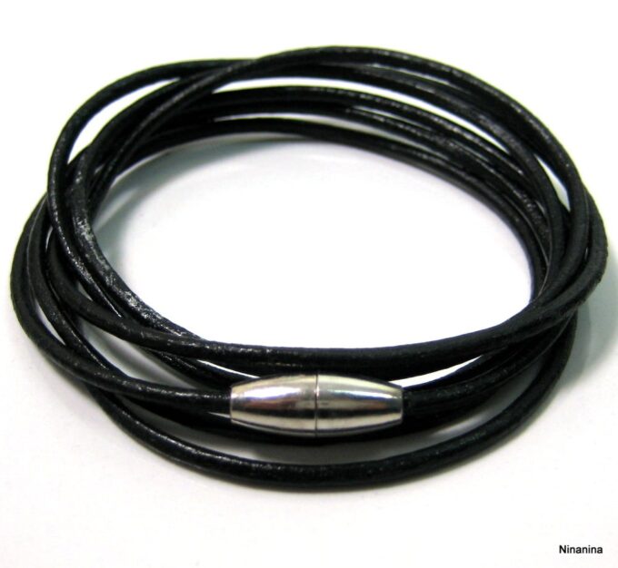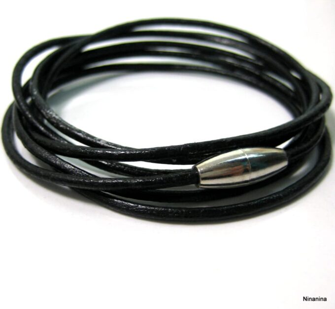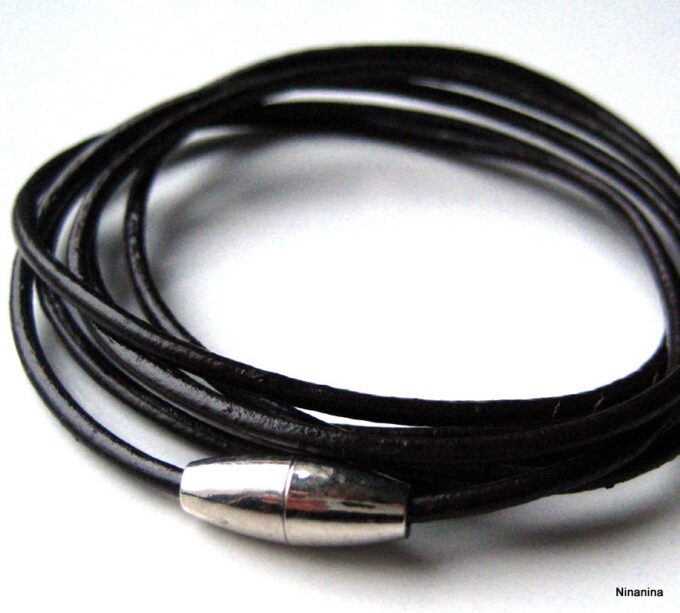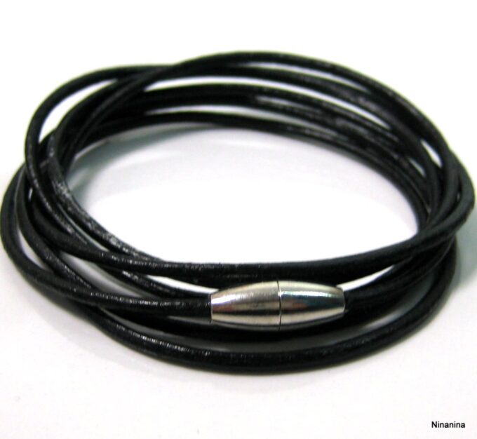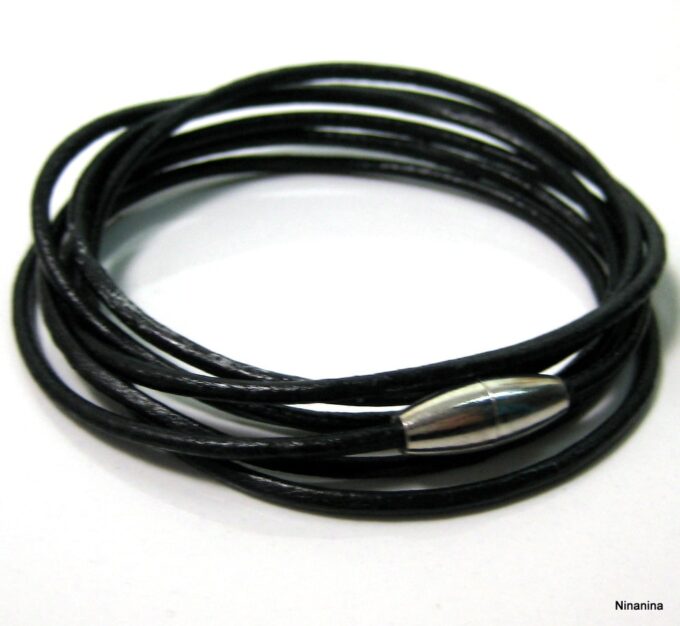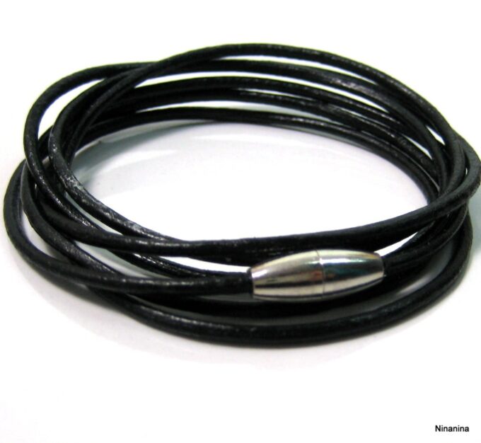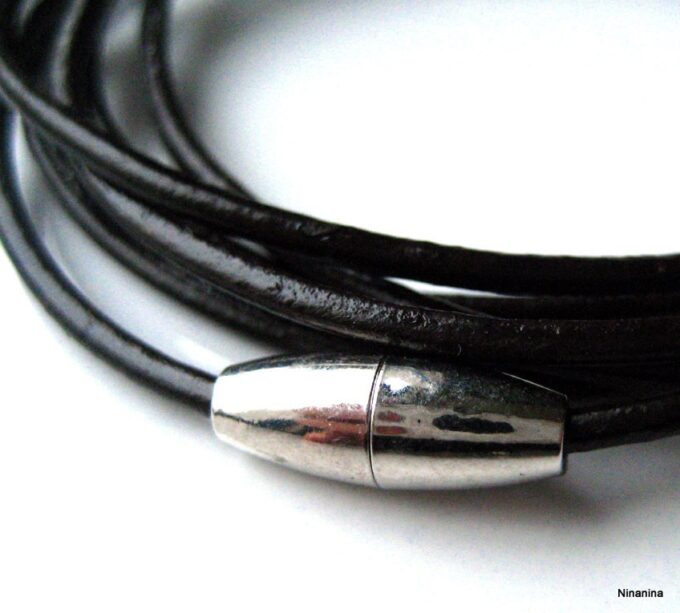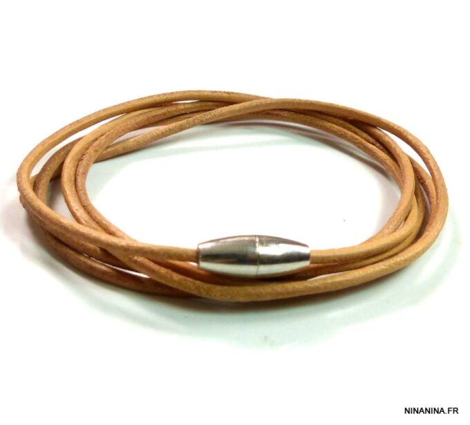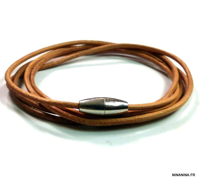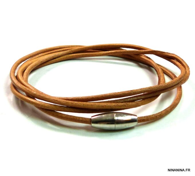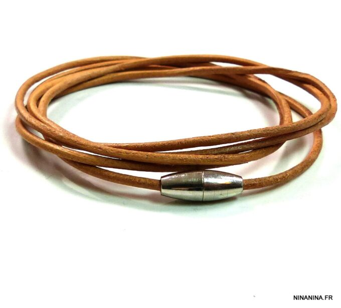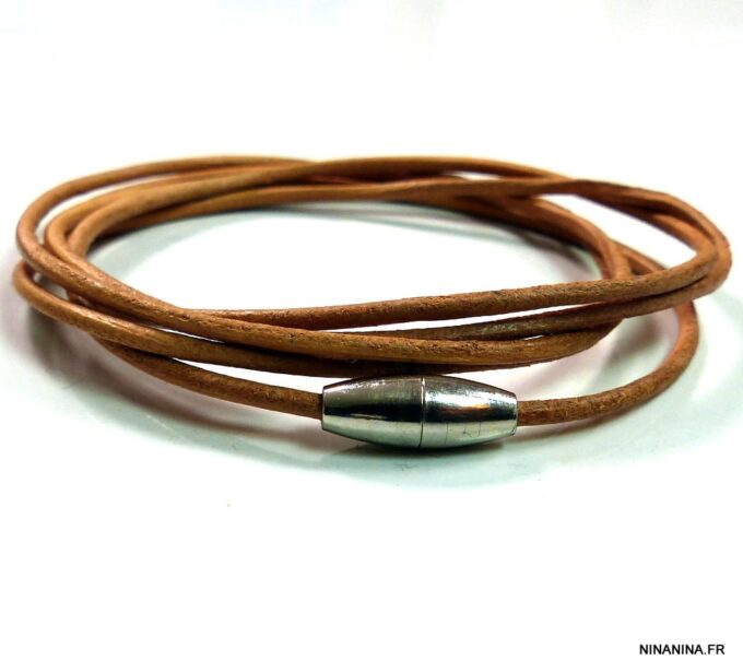 Bracelet wrap cordon cuir fermoir acier aimanté composé d’un cordon de cuir naturel (2 mm de diamètre) à enrouler autour du poignet (5 tours) monté sur un fermoir magnétique cylindrique en acier inoxydable. Dim du fermoir : 1,6 X 0,6 cm. Existe aussi avec un cordon noir, gris, turquoise, fuschia et naturel. Longueur : 97 cm env (pour homme) et 87 cm env (pour femme). Livré dans sa pochette d’organza. Bijou 100% fait main.