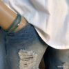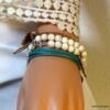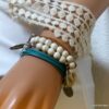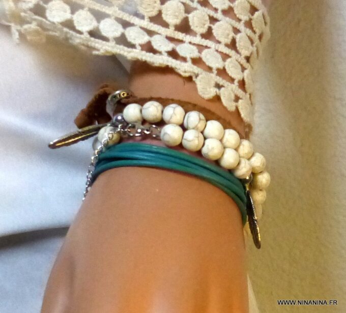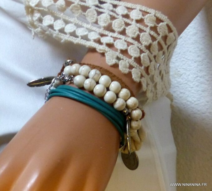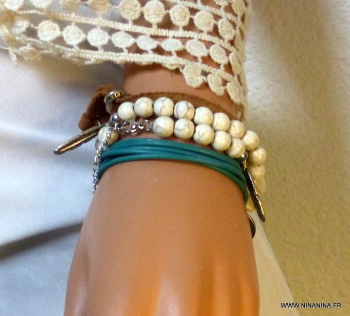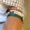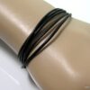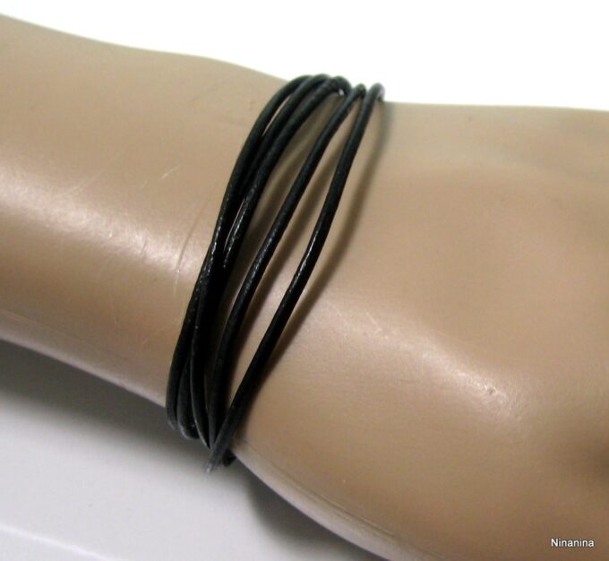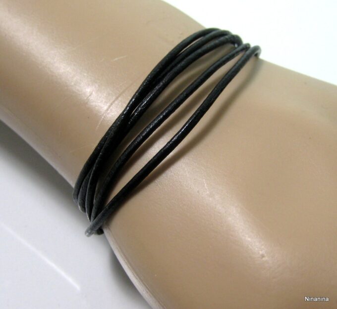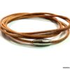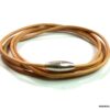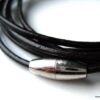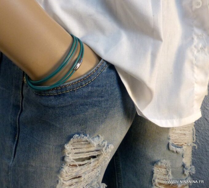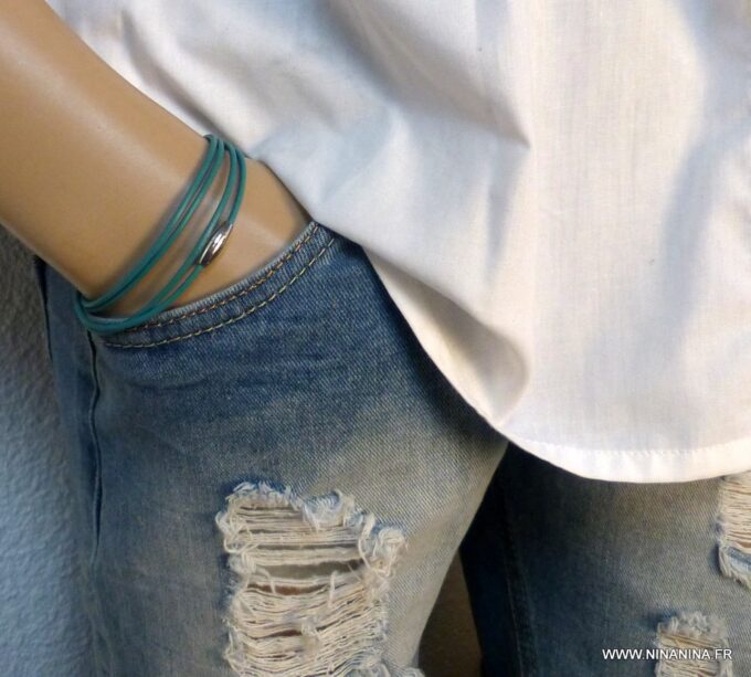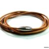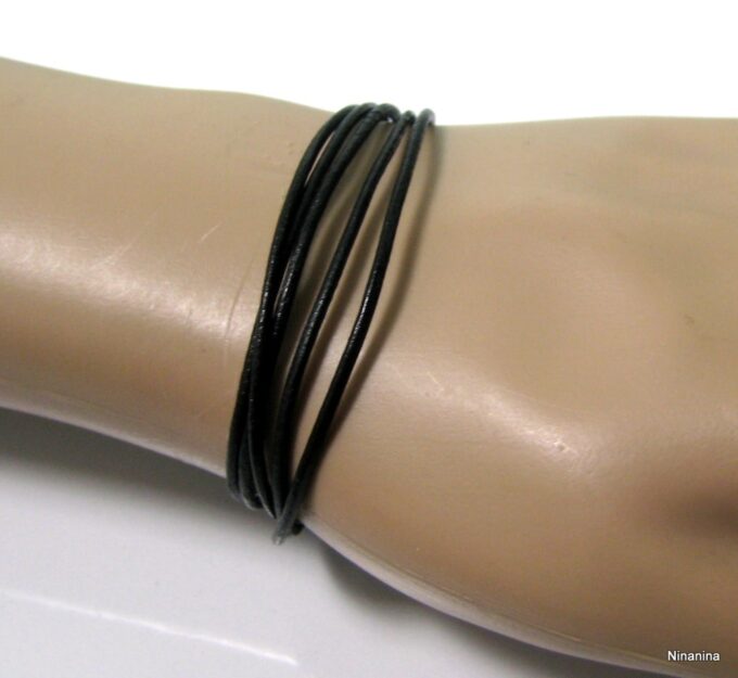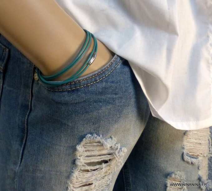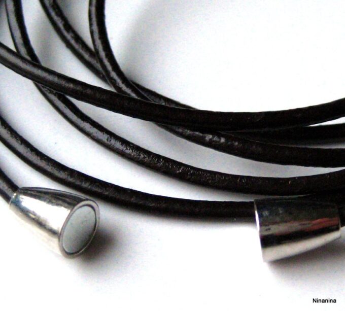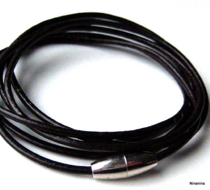Bracelet wrap cordon cuir fermoir acier aimanté composé d’un cordon de cuir naturel (2 mm de diamètre) à enrouler autour du poignet (5 tours) monté sur un fermoir magnétique cylindrique en acier inoxydable. Dim du fermoir : 1,6 X 0,6 cm. Existe aussi avec un cordon noir, gris, turquoise, fuschia et naturel. Longueur : 97 cm env (pour homme) et 87 cm env (pour femme). Livré dans sa pochette d’organza. Bijou 100% fait main.