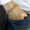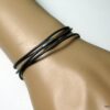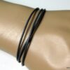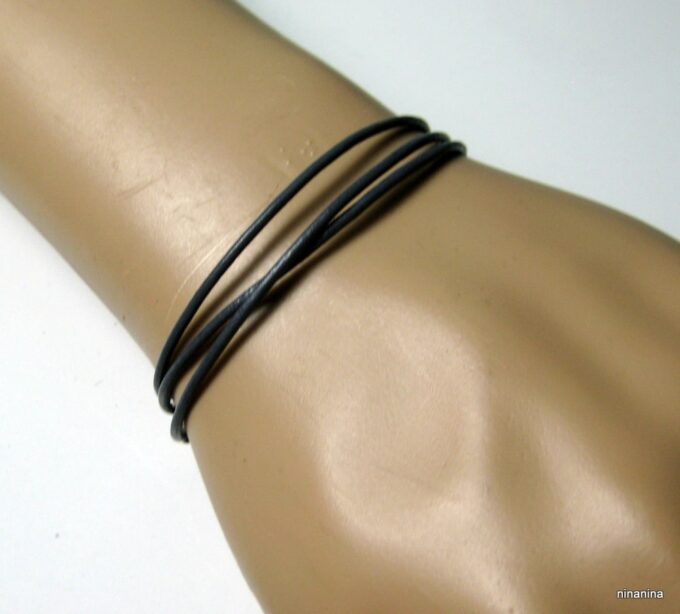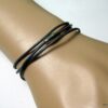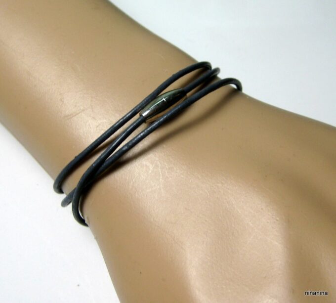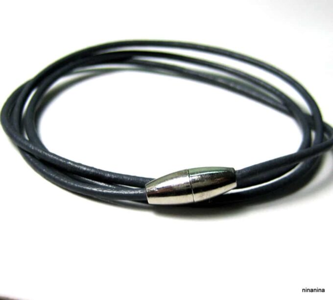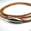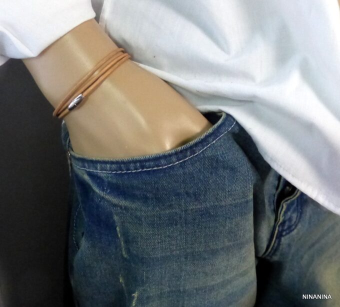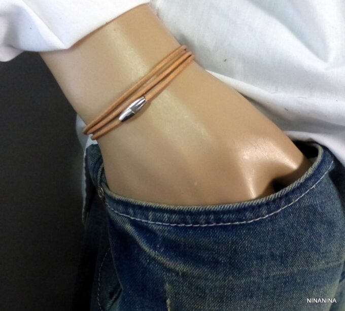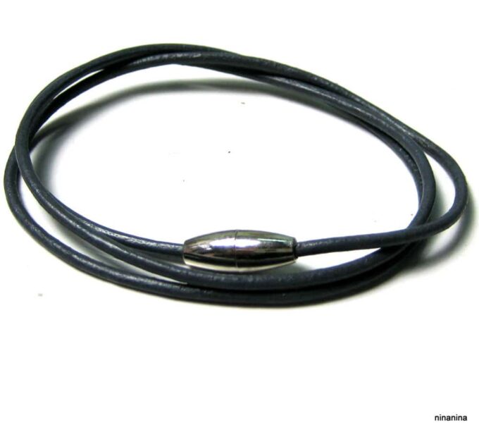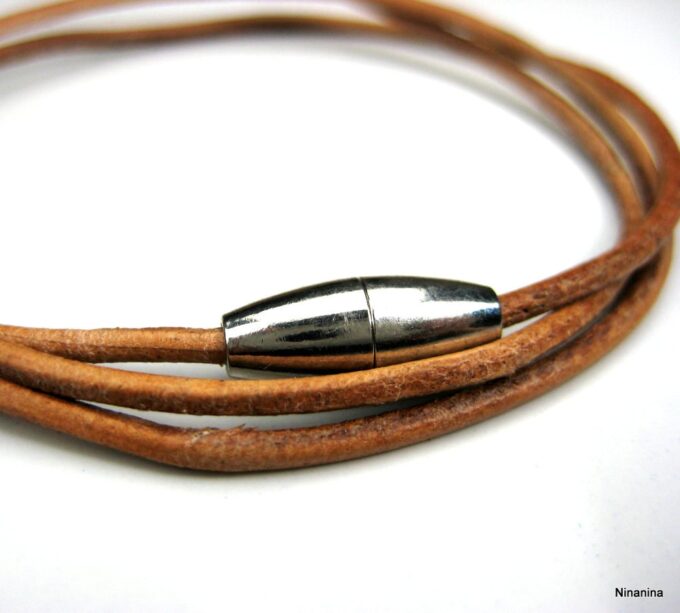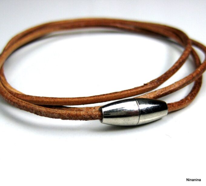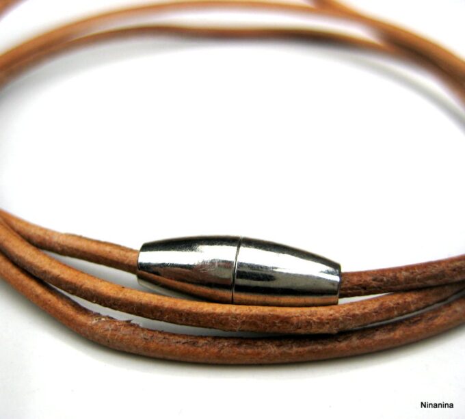 Bracelet cordon cuir fermoir acier aimanté composé d’un cordon de cuir naturel (2 mm de diamètre) à enrouler autour du poignet (3 tours) monté sur un fermoir magnétique cylindrique en acier inoxydable.