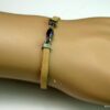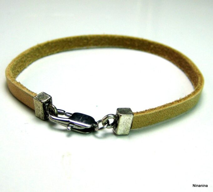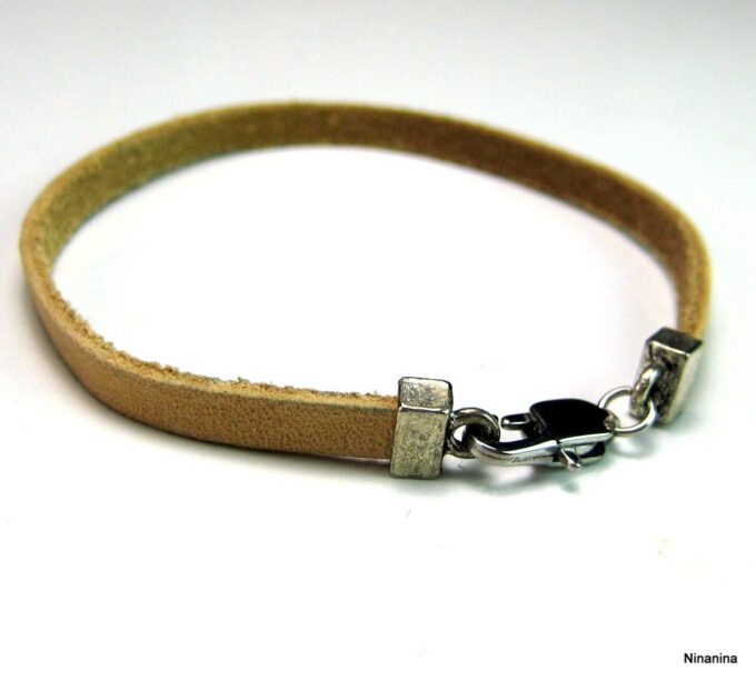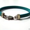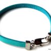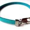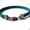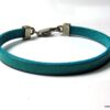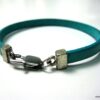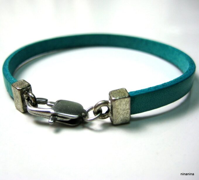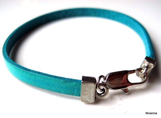 Bracelet cuir turquoise composé d’un bandeau de cuir bleu turquoise monté sur un fermoir en métal argenté. Largeur du bandeau : 5 mm. Fermoir mousqueton. Longueur (fermoir compris) : 21 cm (homme) et 19 cm (femme). Livré dans sa pochette d’organza. Bijou 100% fait-main