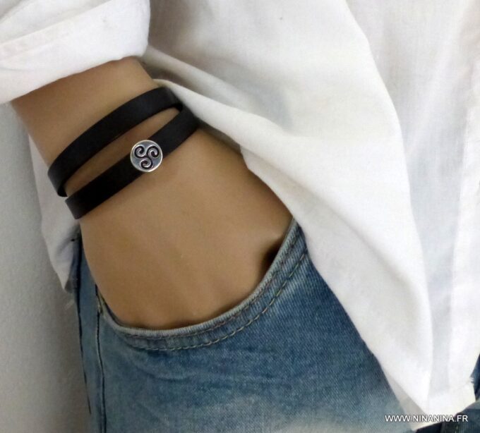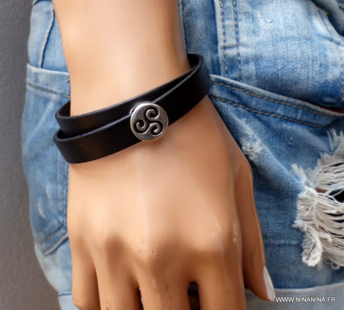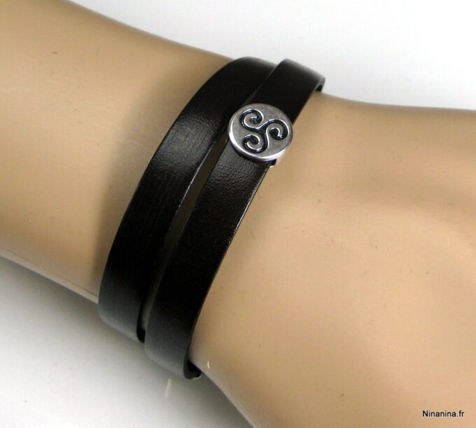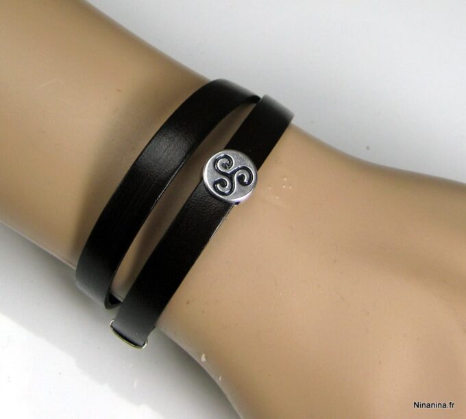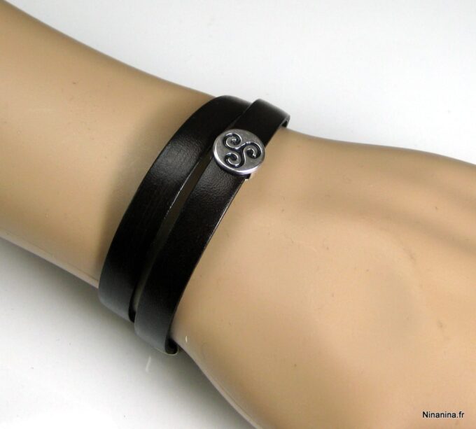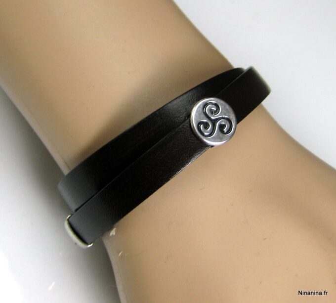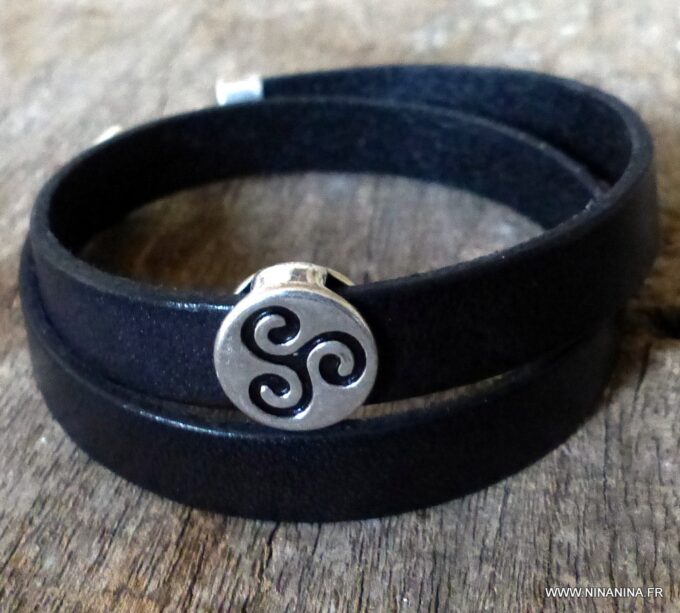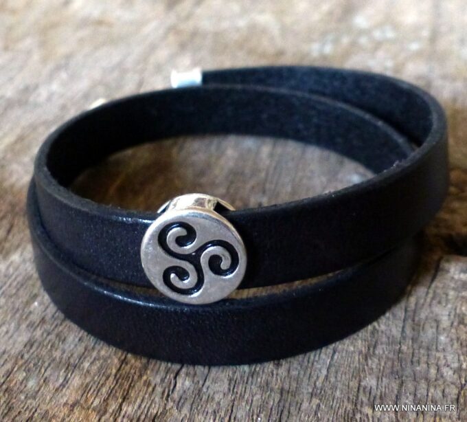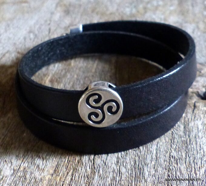 Bracelet cuir 2 tours perle plate triskel métal argenté composé d’une perle circulaire plate triskel en métal argenté coulissant sur un lien en cuir (10mm de large).
