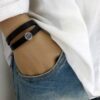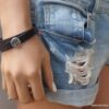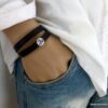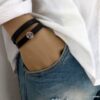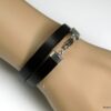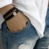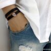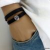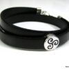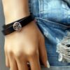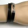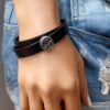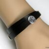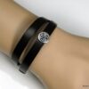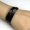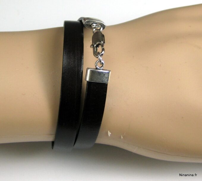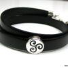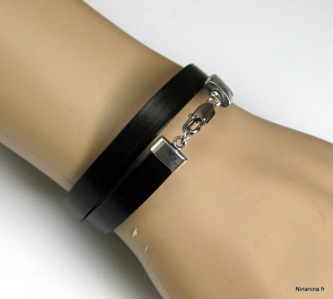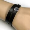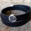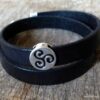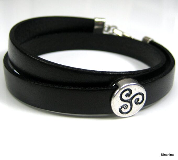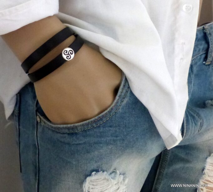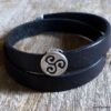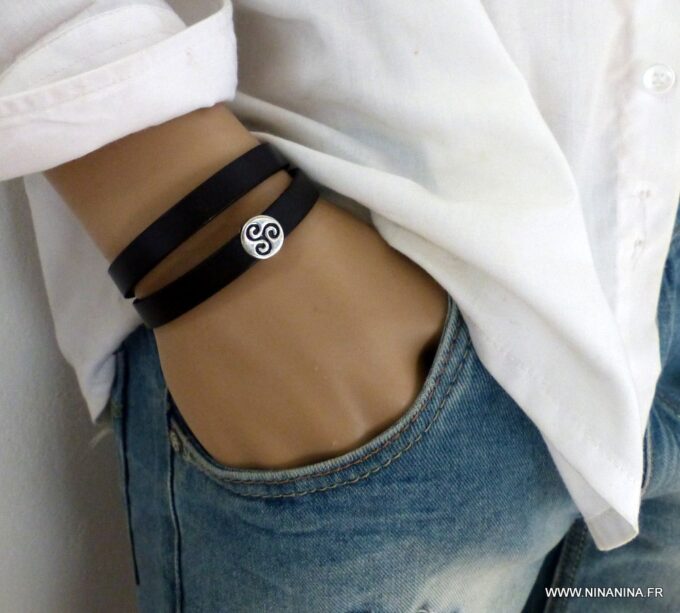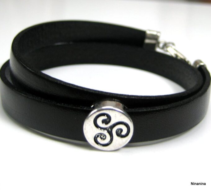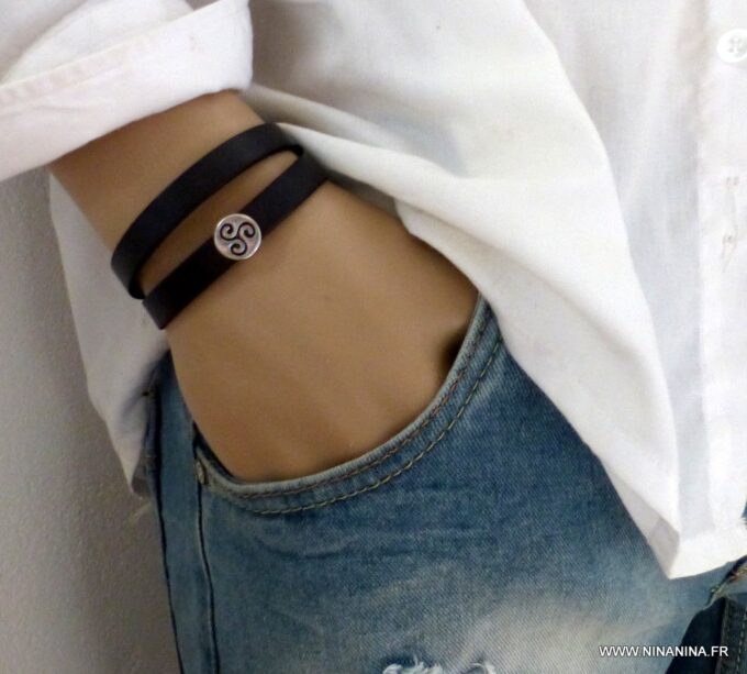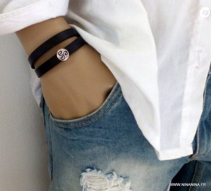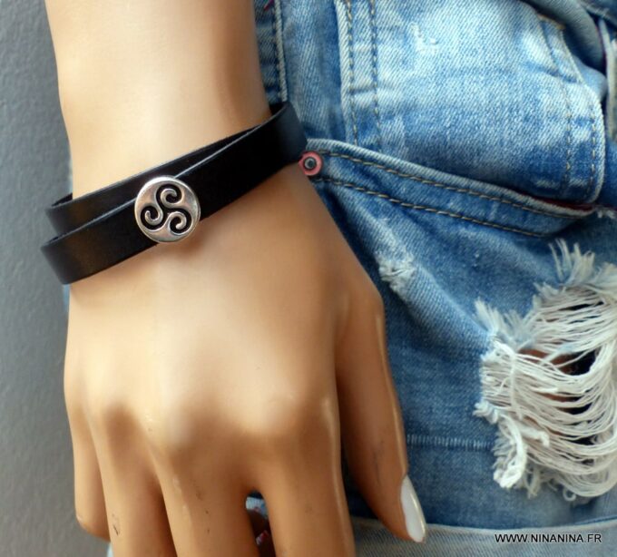 Bracelet cuir 2 tours perle plate triskel métal argenté composé d’une perle circulaire plate triskel en métal argenté coulissant sur un lien en cuir (10mm de large).