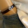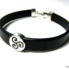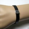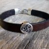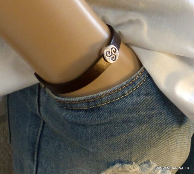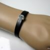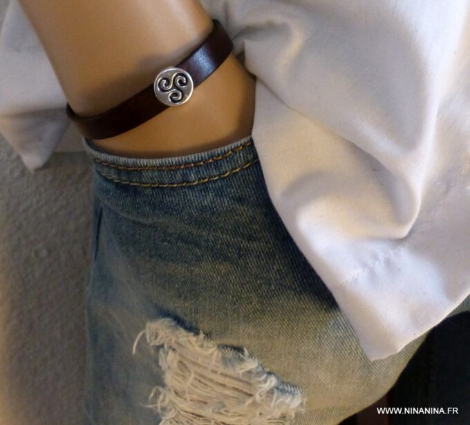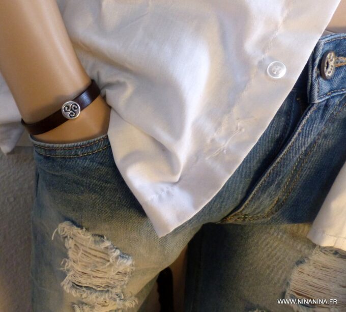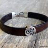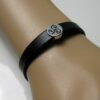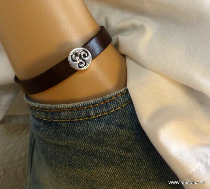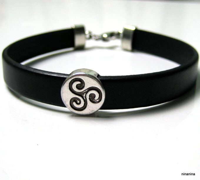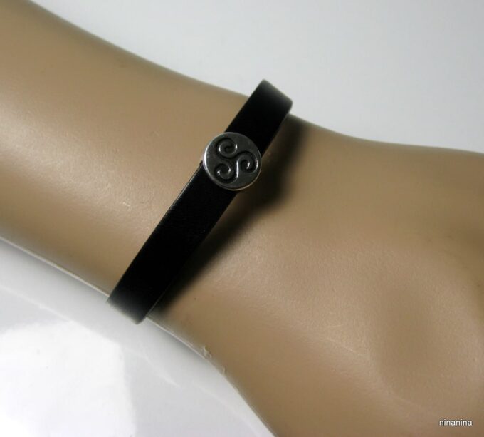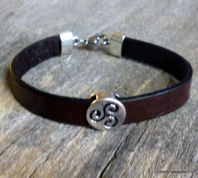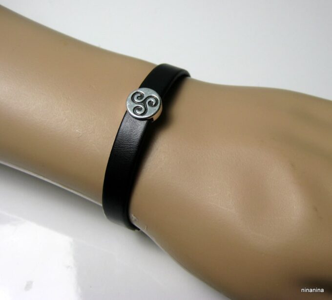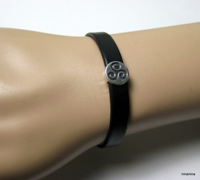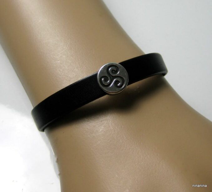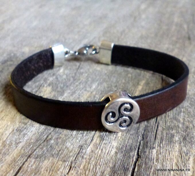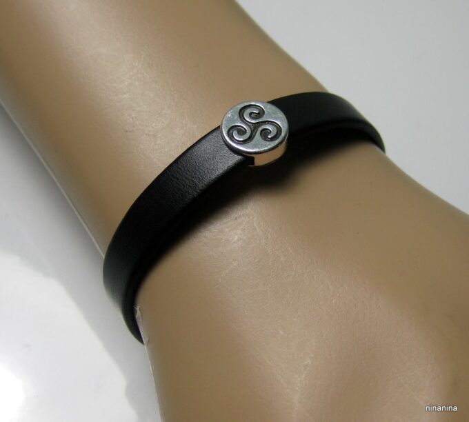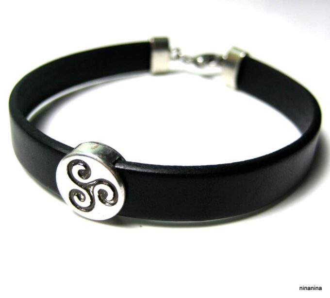 Bracelet homme femme cuir trisquel métal argent composé d’une perle circulaire plate TRISQUEL en métal argenté coulissant sur un lien en cuir noir (10mm de large).