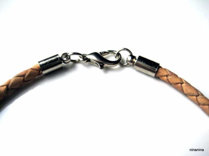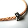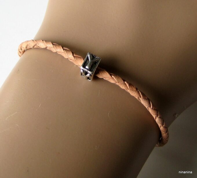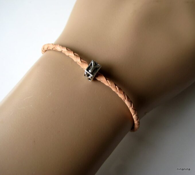 Bracelet cordon cuir tressé et lettre métal argenté composé d’une perle lettre carrée en métal argenté montée sur un cordon de cuir tressé naturel . Diamètre du cordon : 3 mm. Existe aussi en marron chocolat, bleu ciel, noir et rouge. Longueur (fermoir compris) : 21 cm env (pour homme) et 19 cm env (pour femme). Fermoir mousqueton. Livré dans sa pochette d’organza. Bijou 100% fait main.