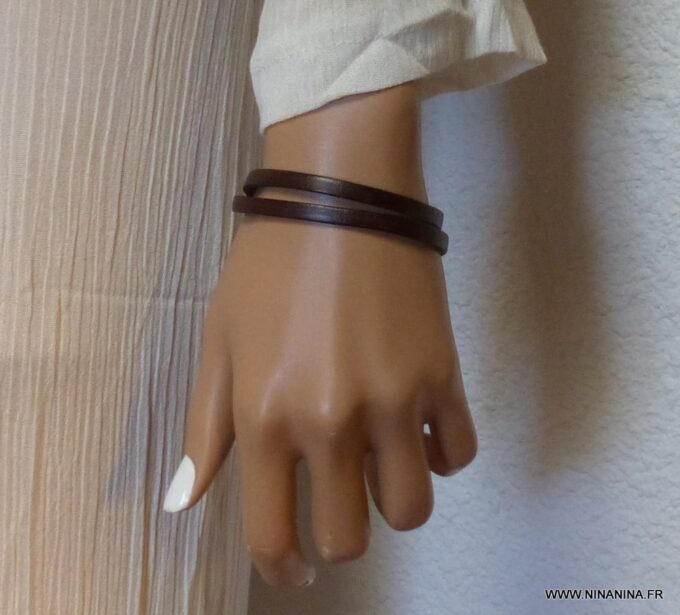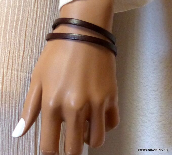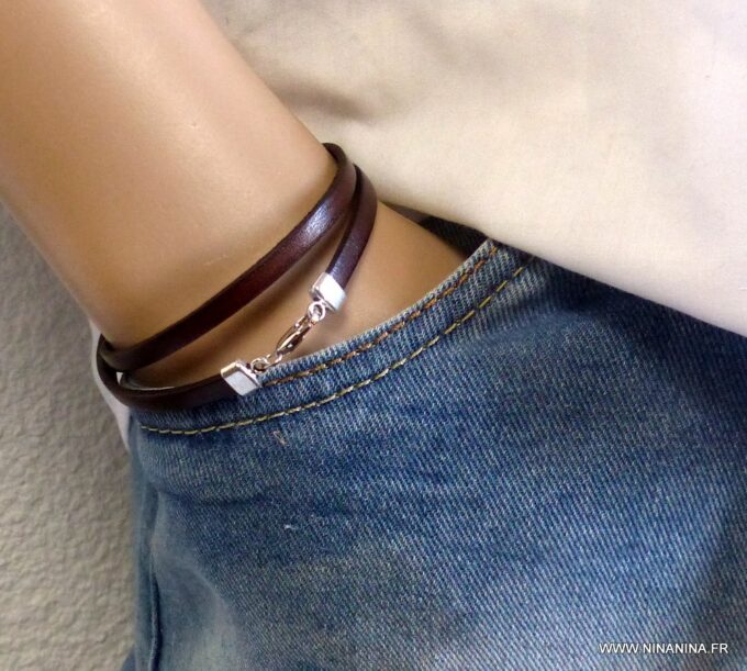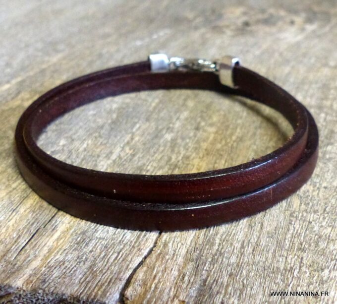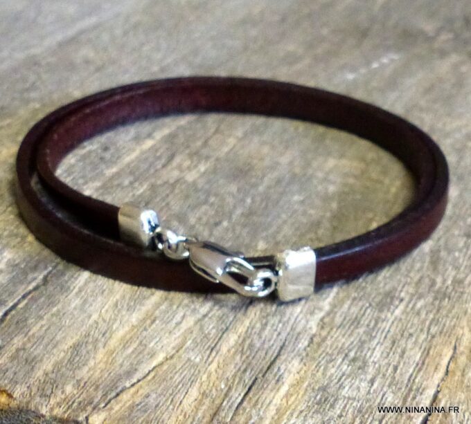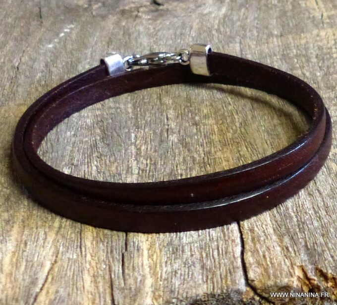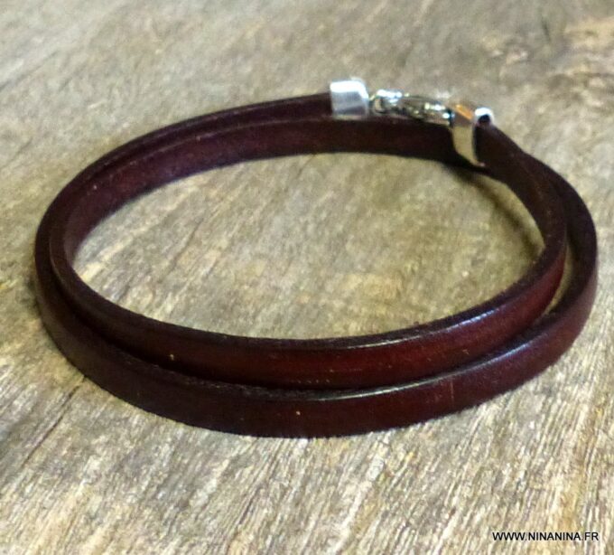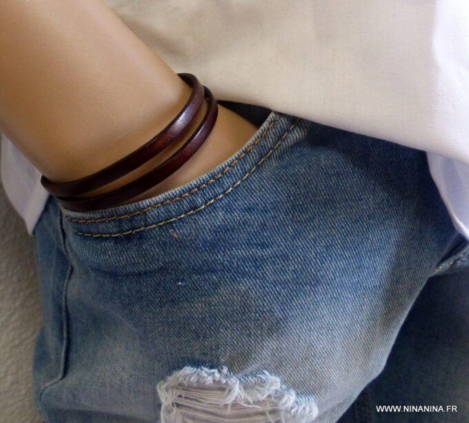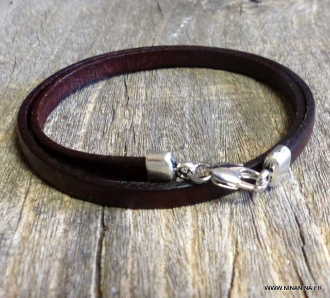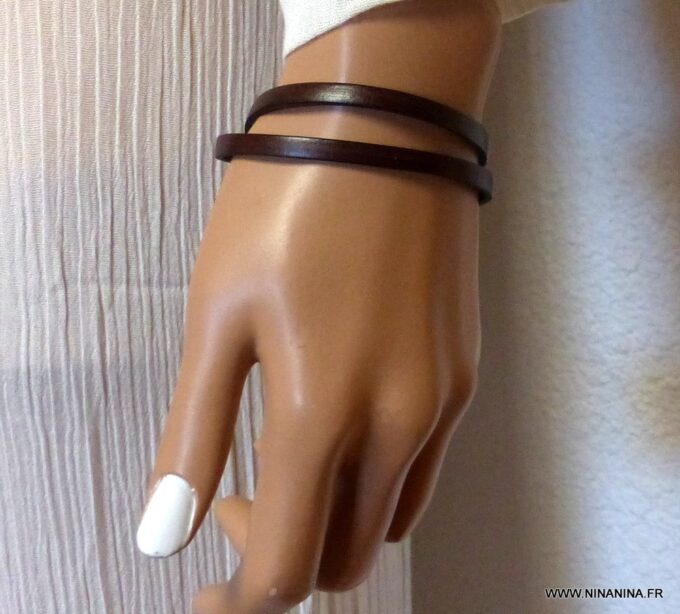 Bracelet homme femme wrap cuir 2 tours composé d’un bandeau de cuir marron chocolat à enrouler autour du poignet (2 tours) monté sur un fermoir en métal argenté.