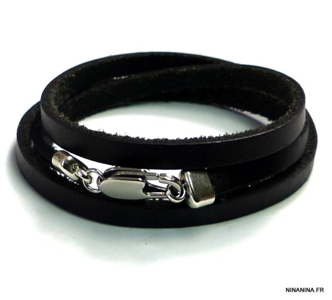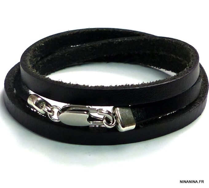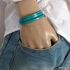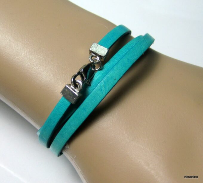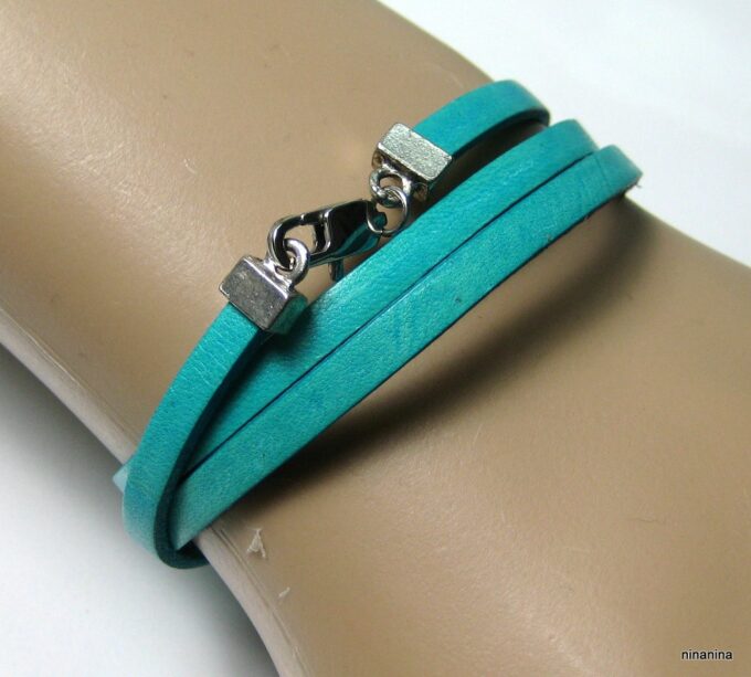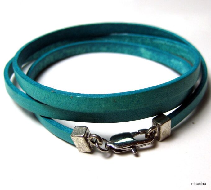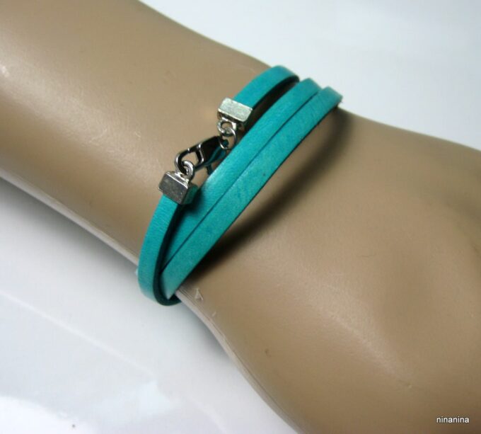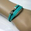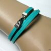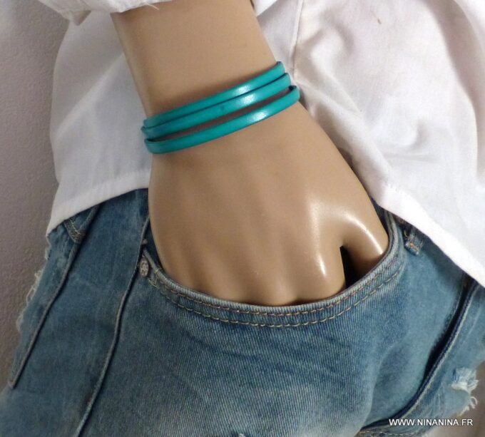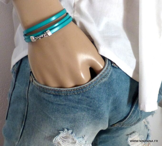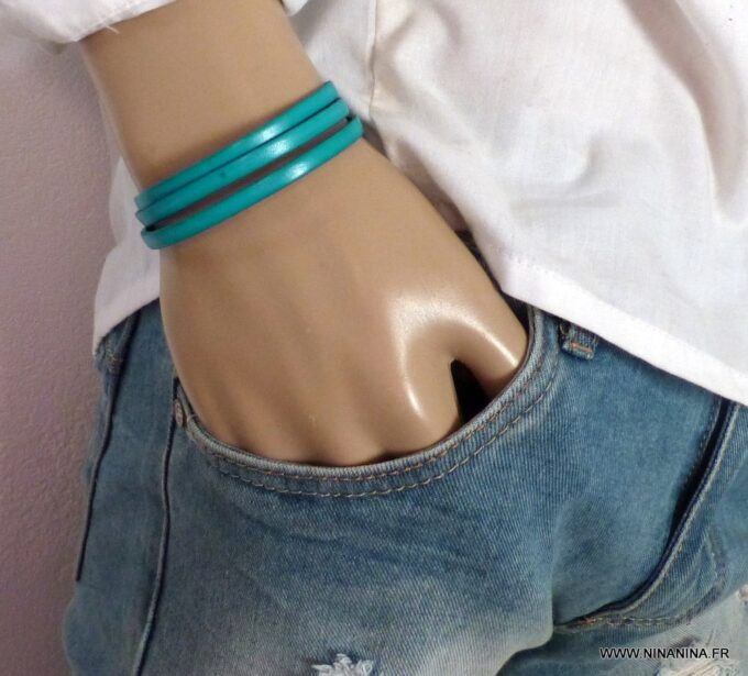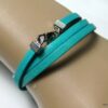Bracelet 3 tours cuir turquoise composé d’une lanière de cuir turquoise à enrouler autour du poignet (3 tours) monté sur un fermoir en métal argenté.
