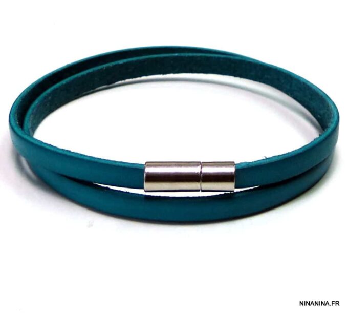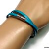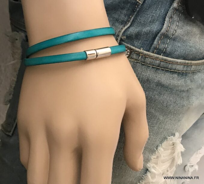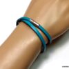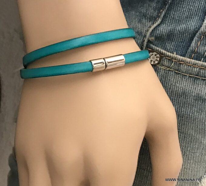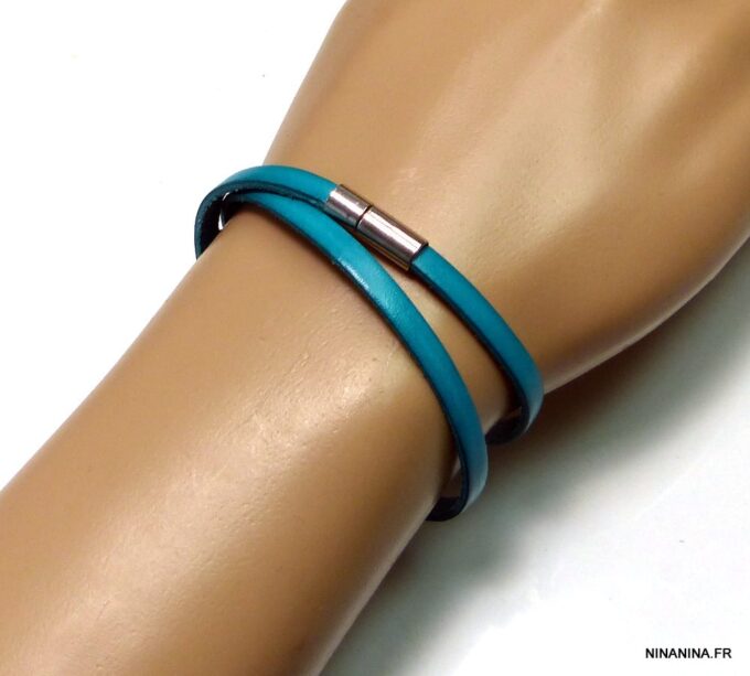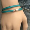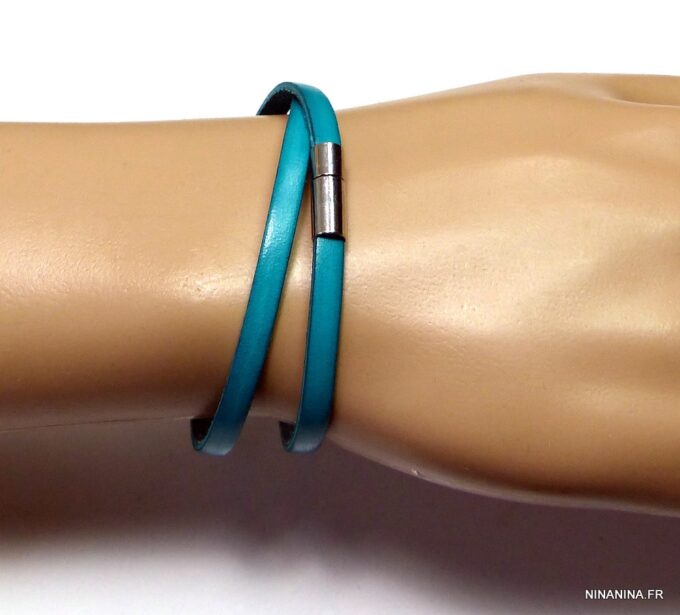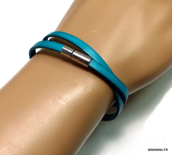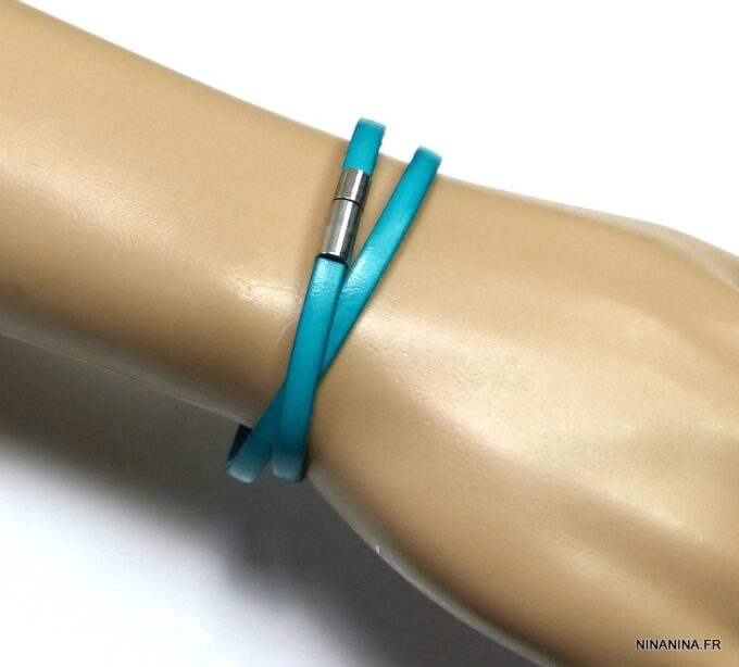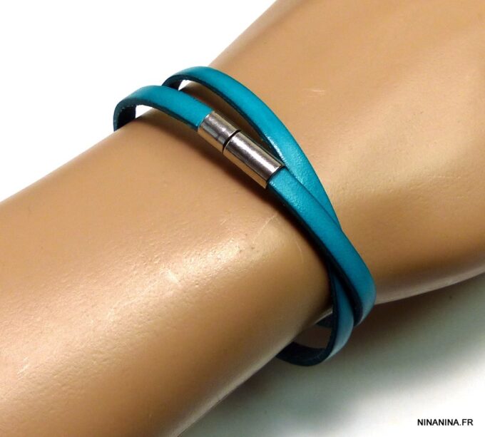 Bracelet cuir turquoise mixte et acier inoxydable argent composé d’un lacet de cuir turquoise (5 mm de large) à enrouler autour du poignet (2 tours).